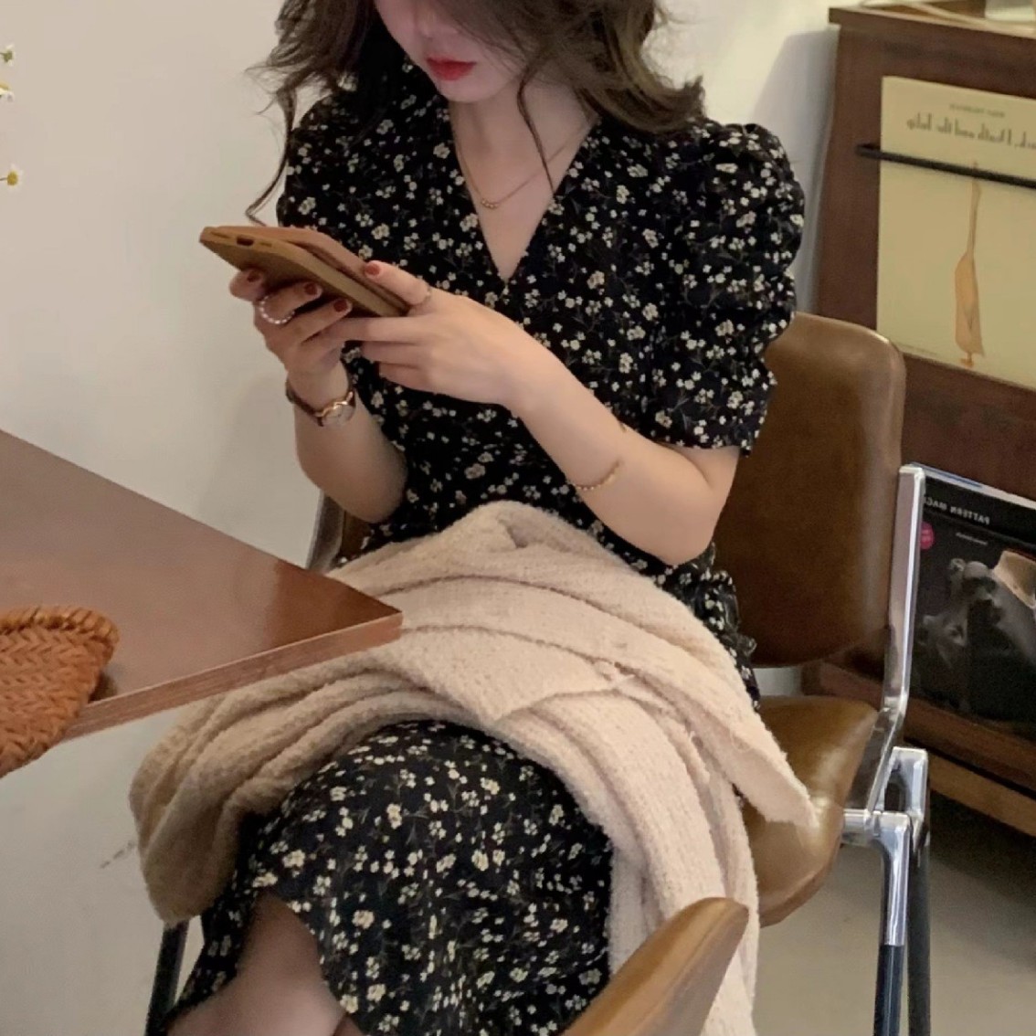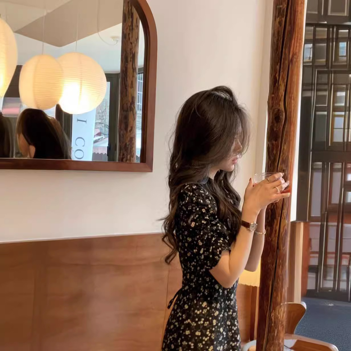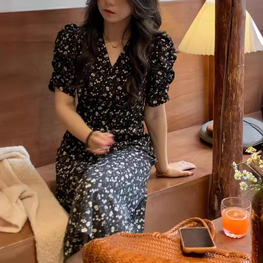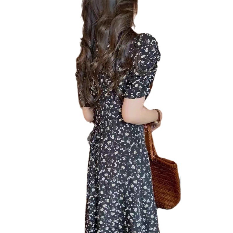 夏季新款法式复古赫本风小黑裙气质温柔风显瘦雪纺碎花连衣裙