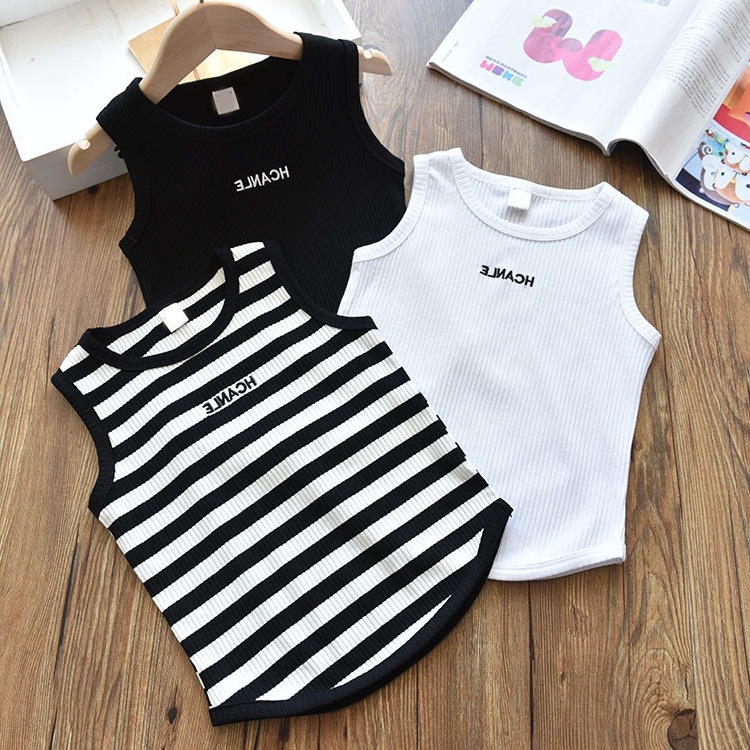 男女童夏装背心上衣宝宝洋气儿童个性潮韩版条纹字母网红无袖T恤