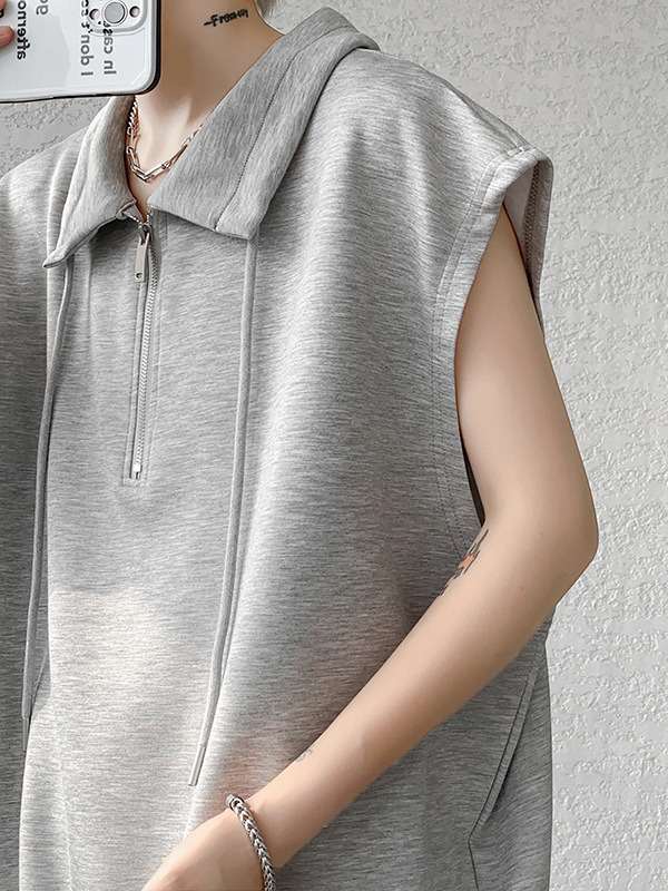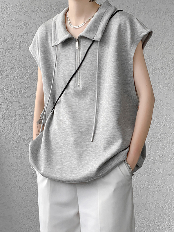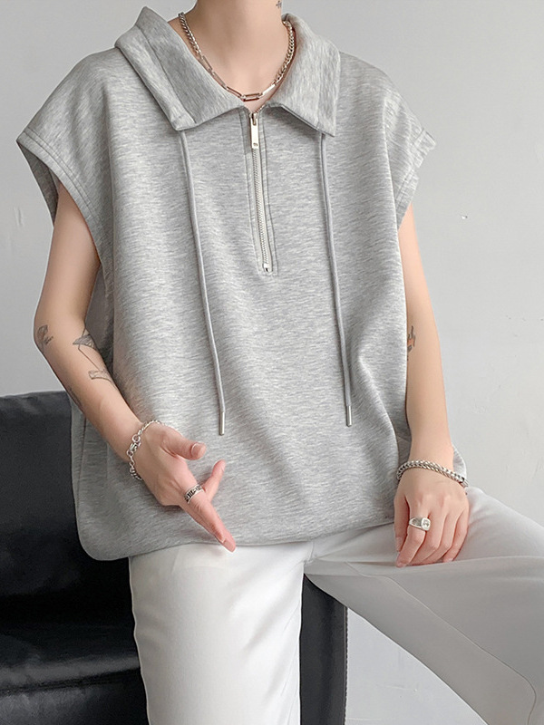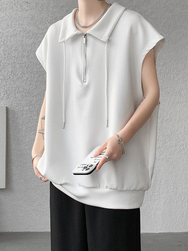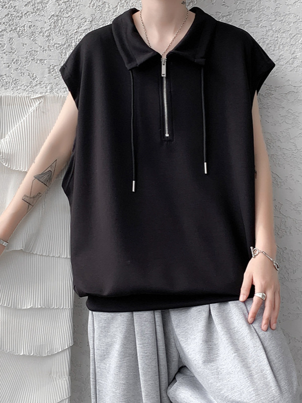 小众半拉链翻领背心男夏季新款美式潮牌设计感坎肩无袖短袖体恤衫