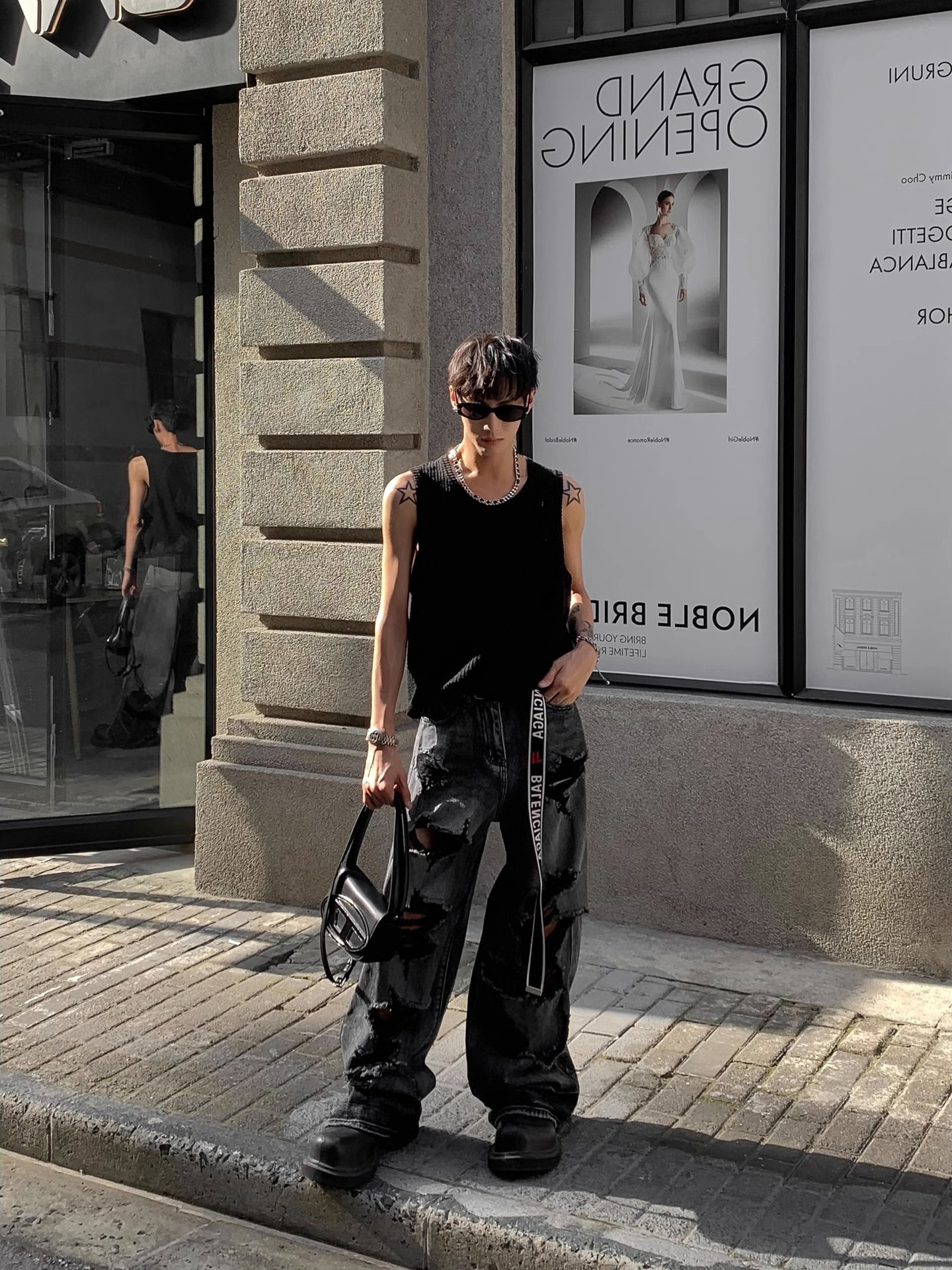 美式休闲无袖背心男2025新款夏季新款宽松运动坎肩t恤上衣潮