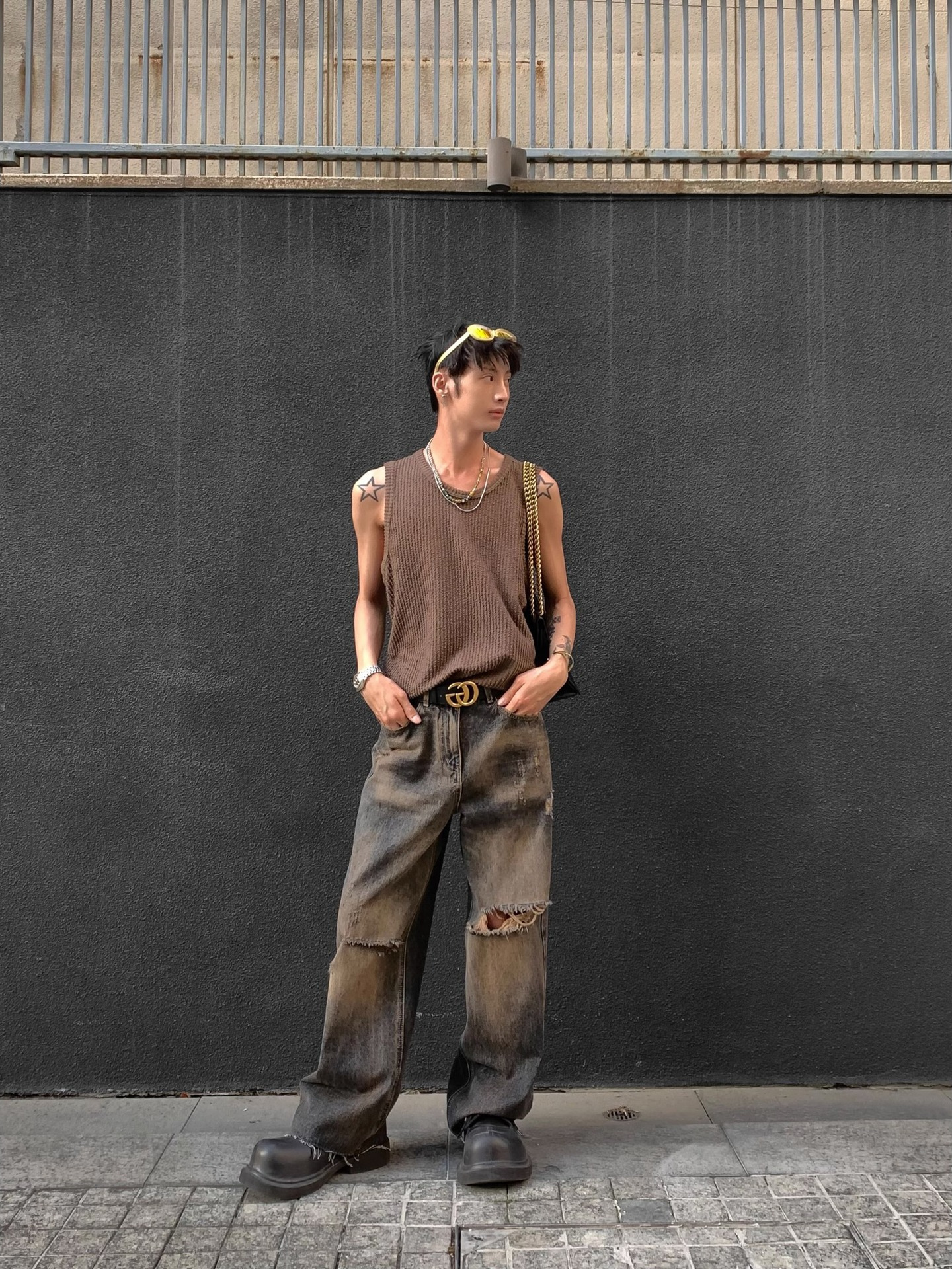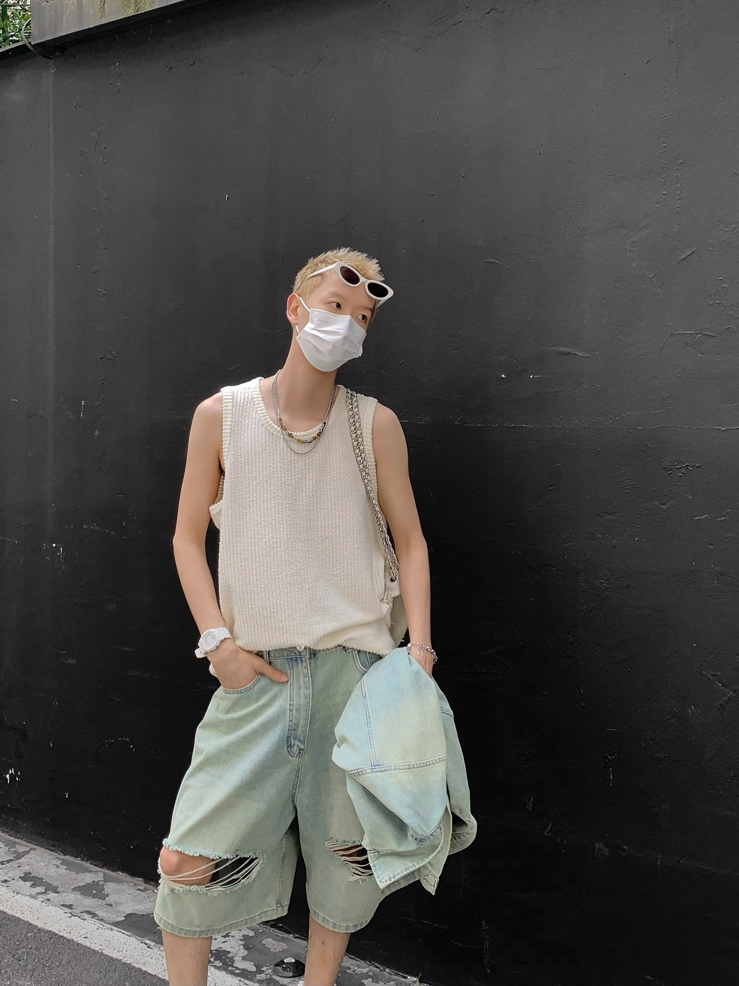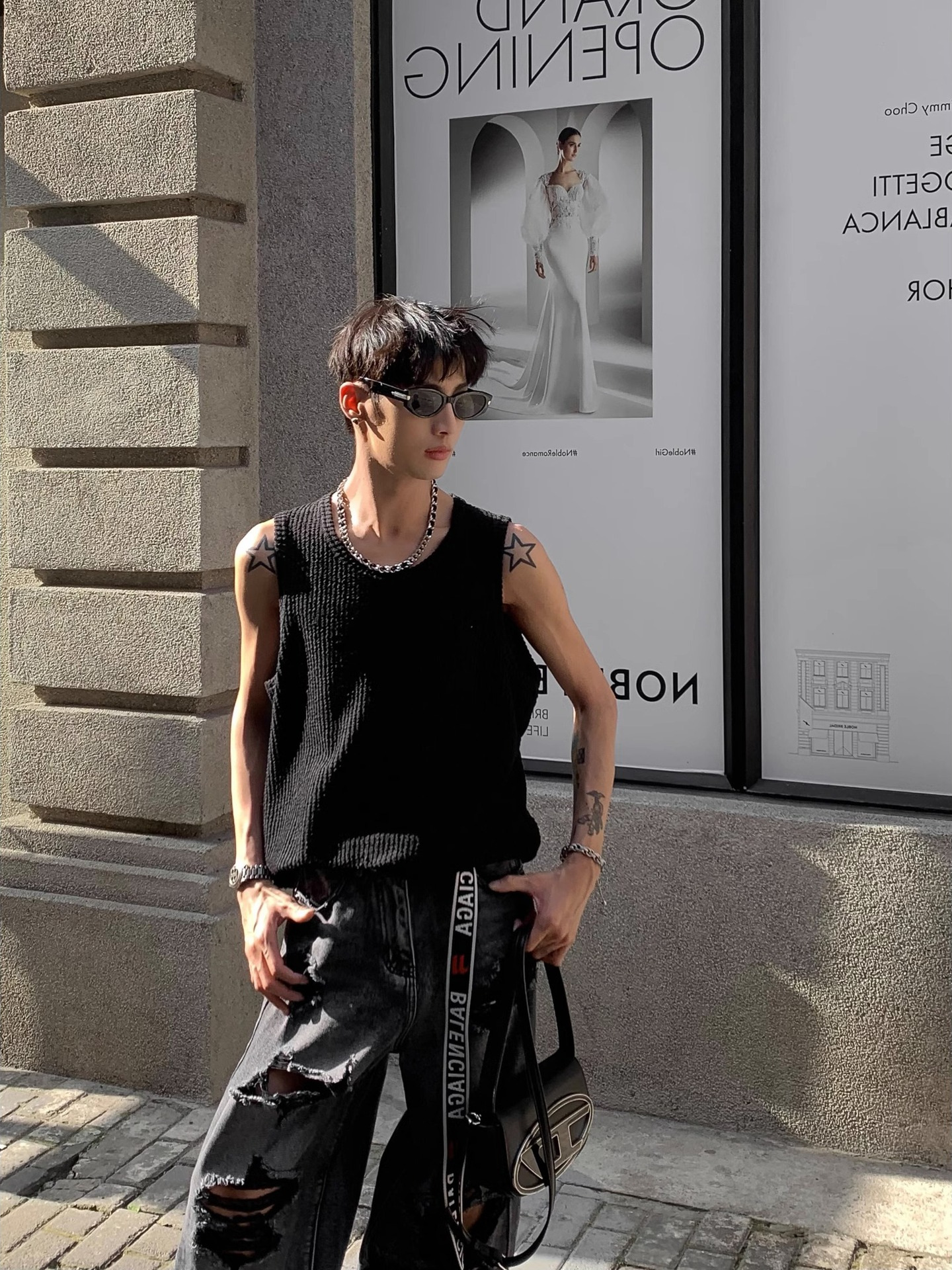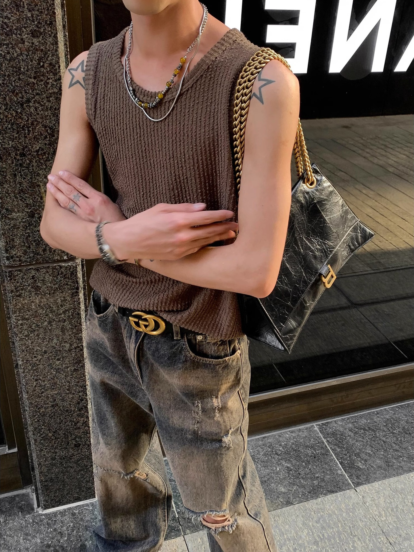 纯色简约竖条纹理小众复古圆领背心男夏季新款休闲百搭无袖T恤衫