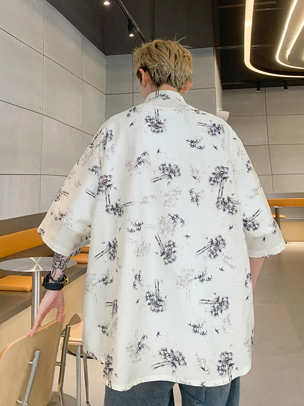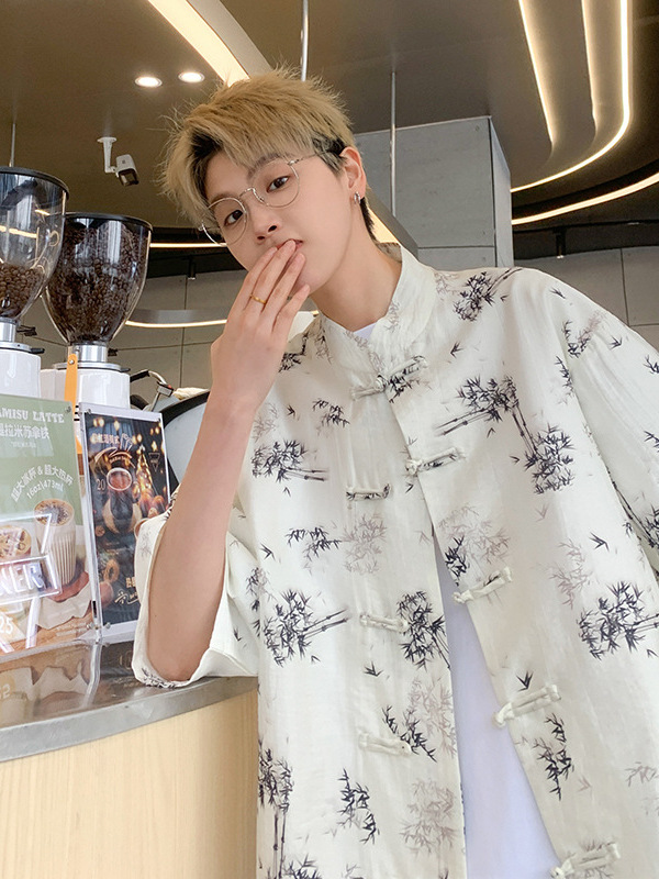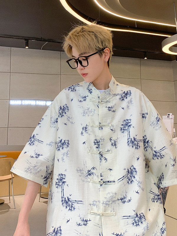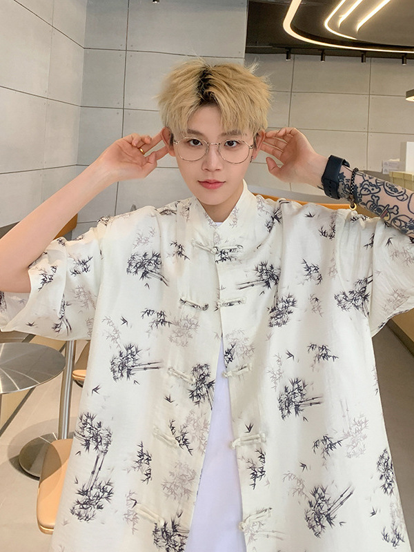 中国风竹子印花短袖衬衫男夏季新中式盘扣潮流宽松青少年半袖衬衣