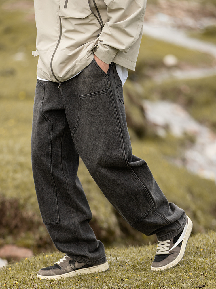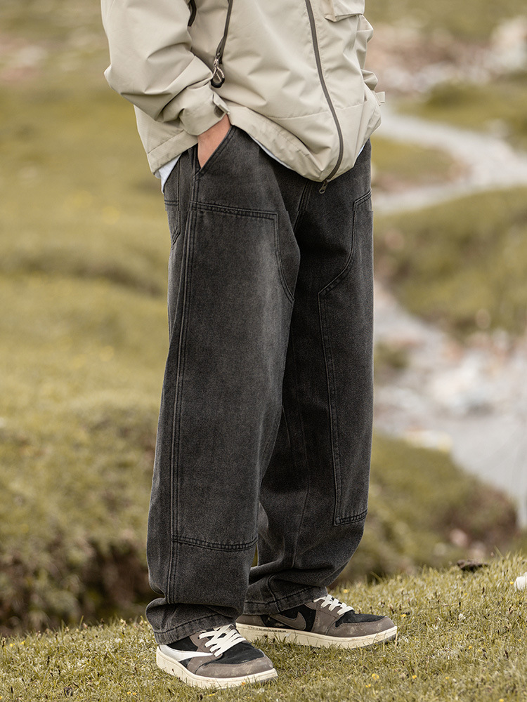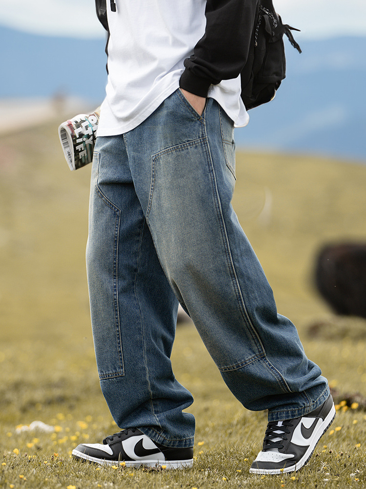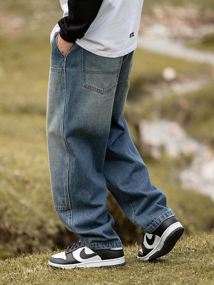双膝水洗复古做旧牛仔裤秋季新款伐木裤子宽松直筒日系休闲长裤