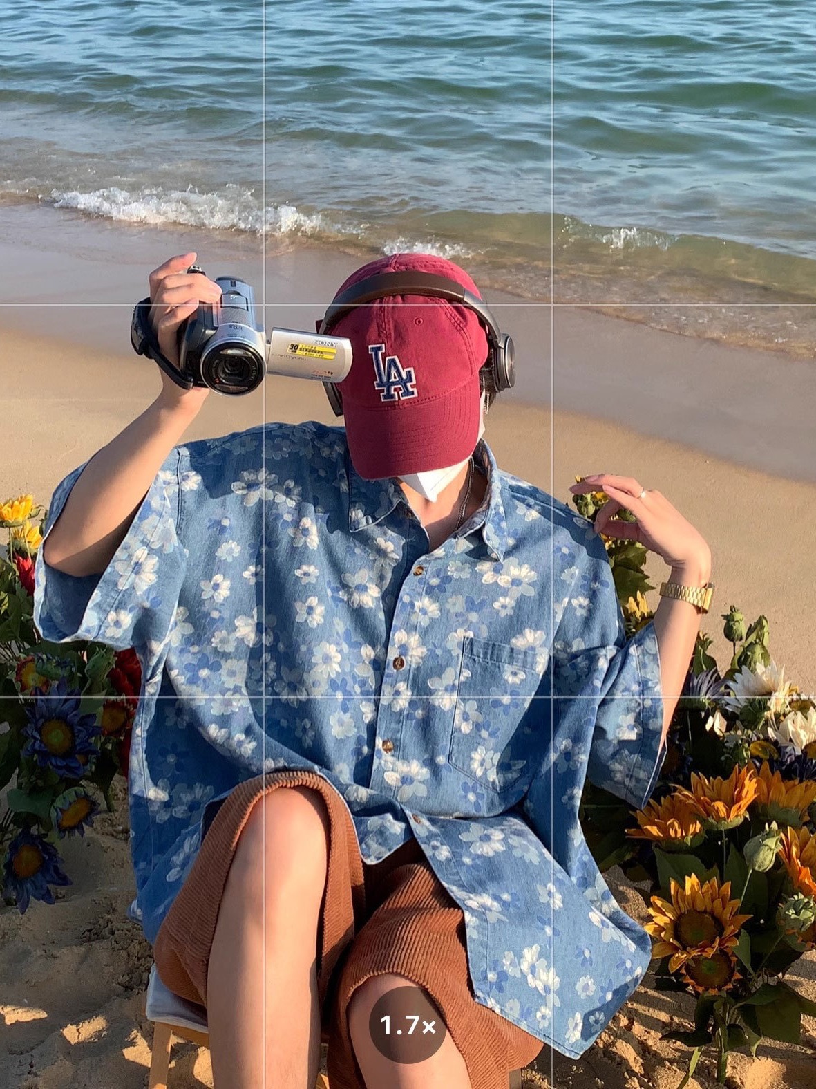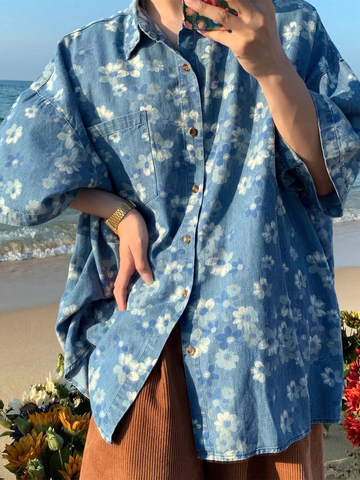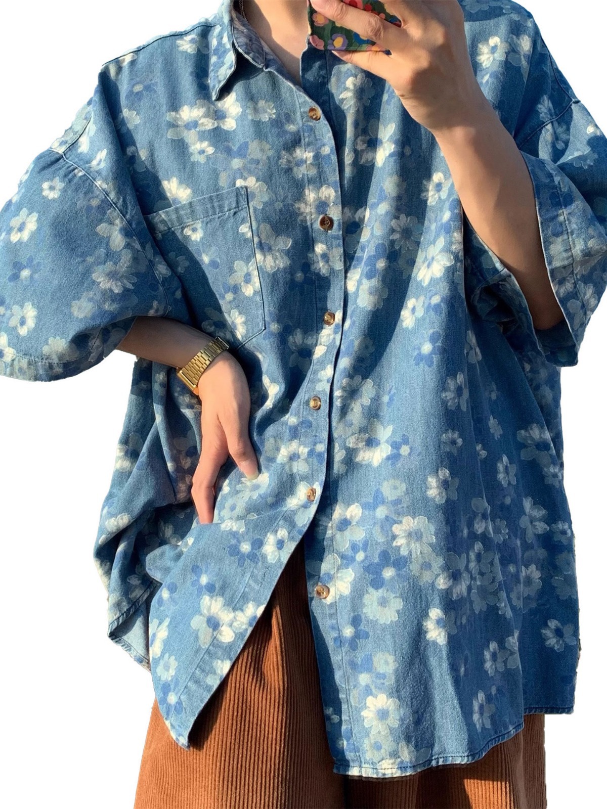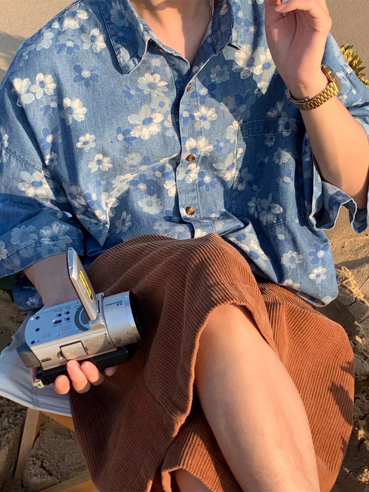 日系复古花朵满印水洗做旧牛仔短袖衬衫男夏季新款宽松休闲衬衣潮