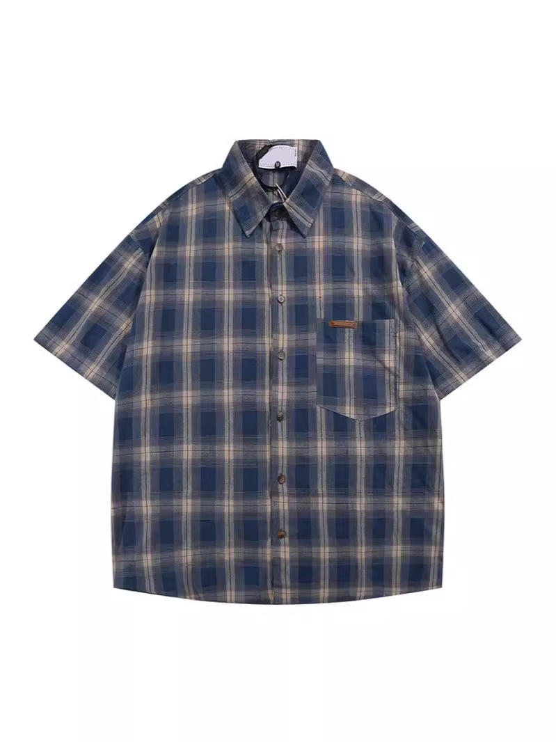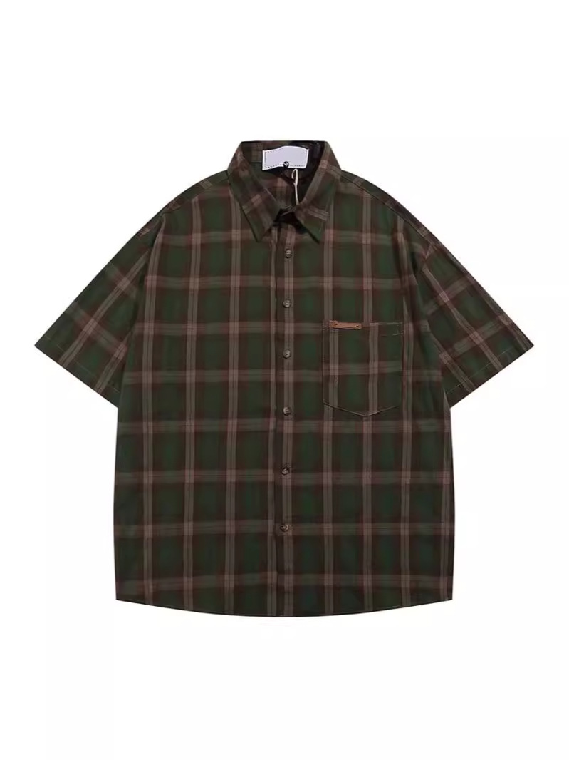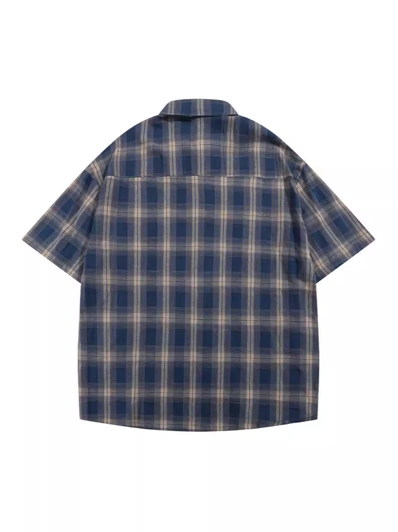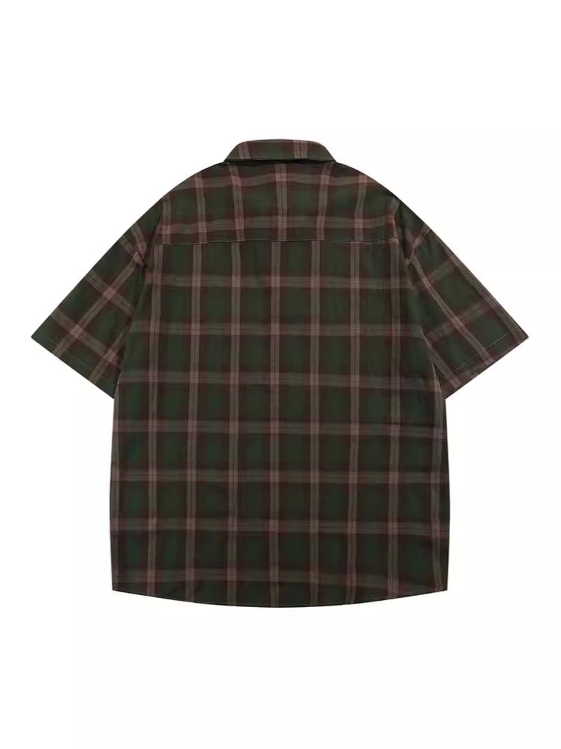 日系复古格子中性短袖衬衣男士夏季新款小众BF风宽松情侣衬衫外套