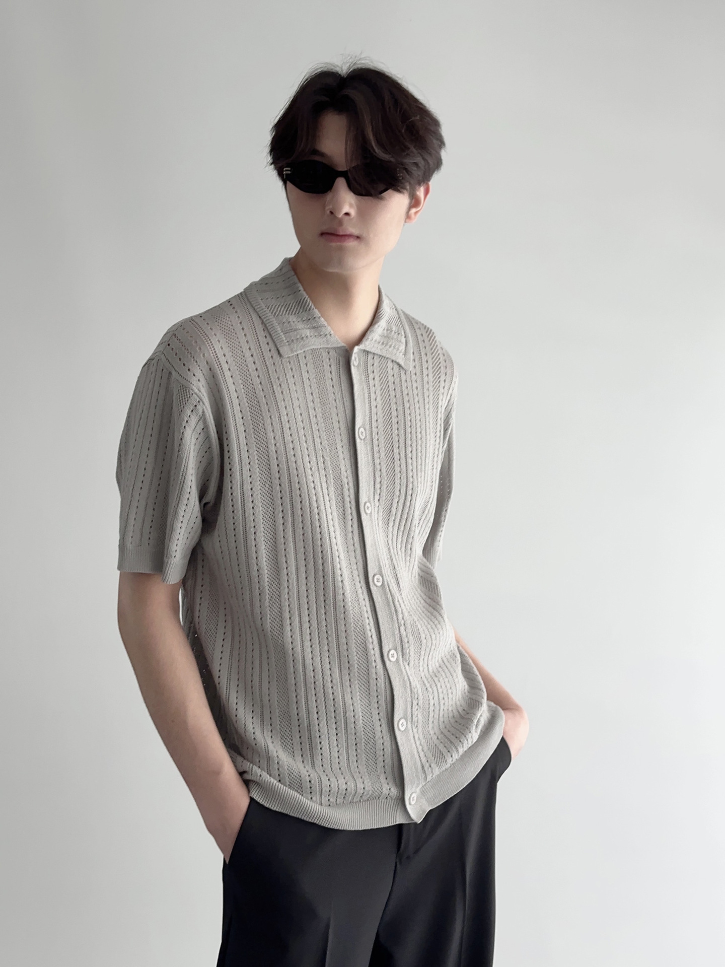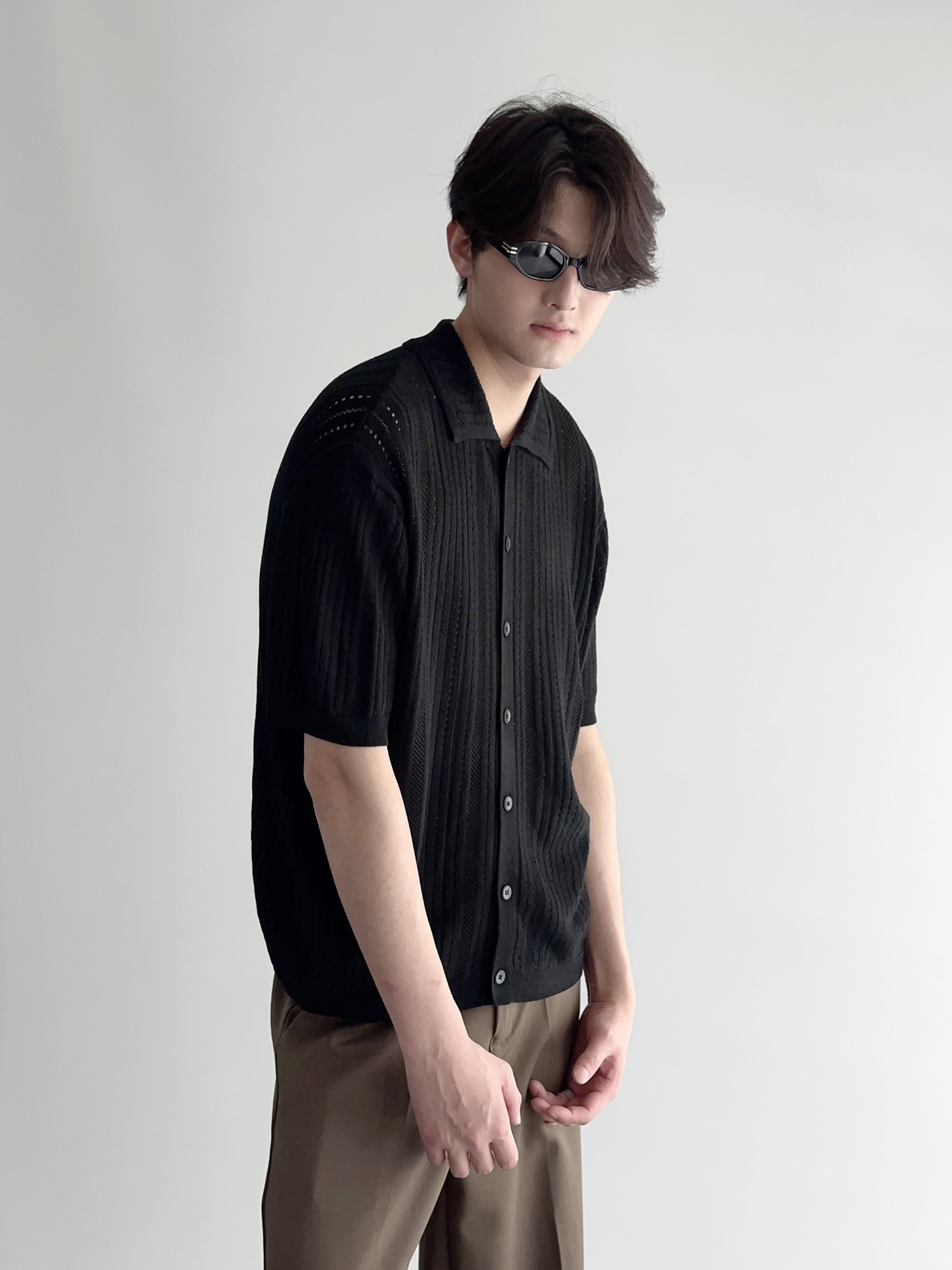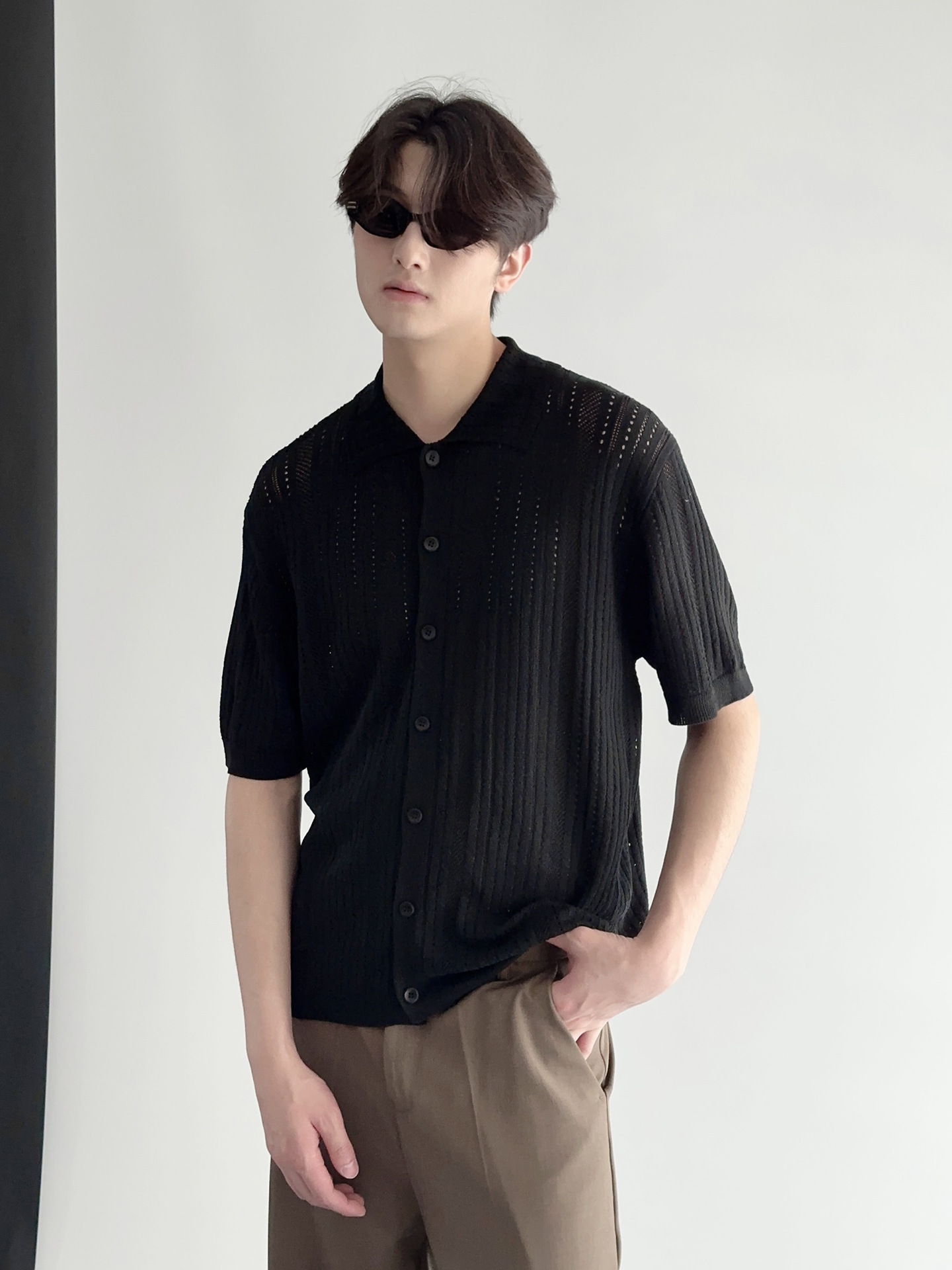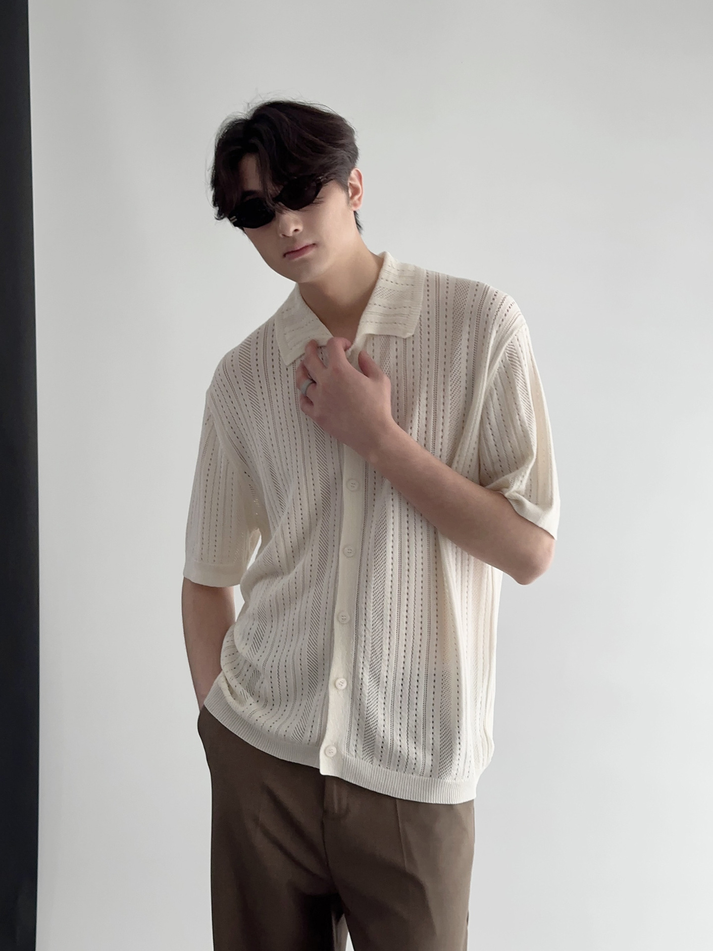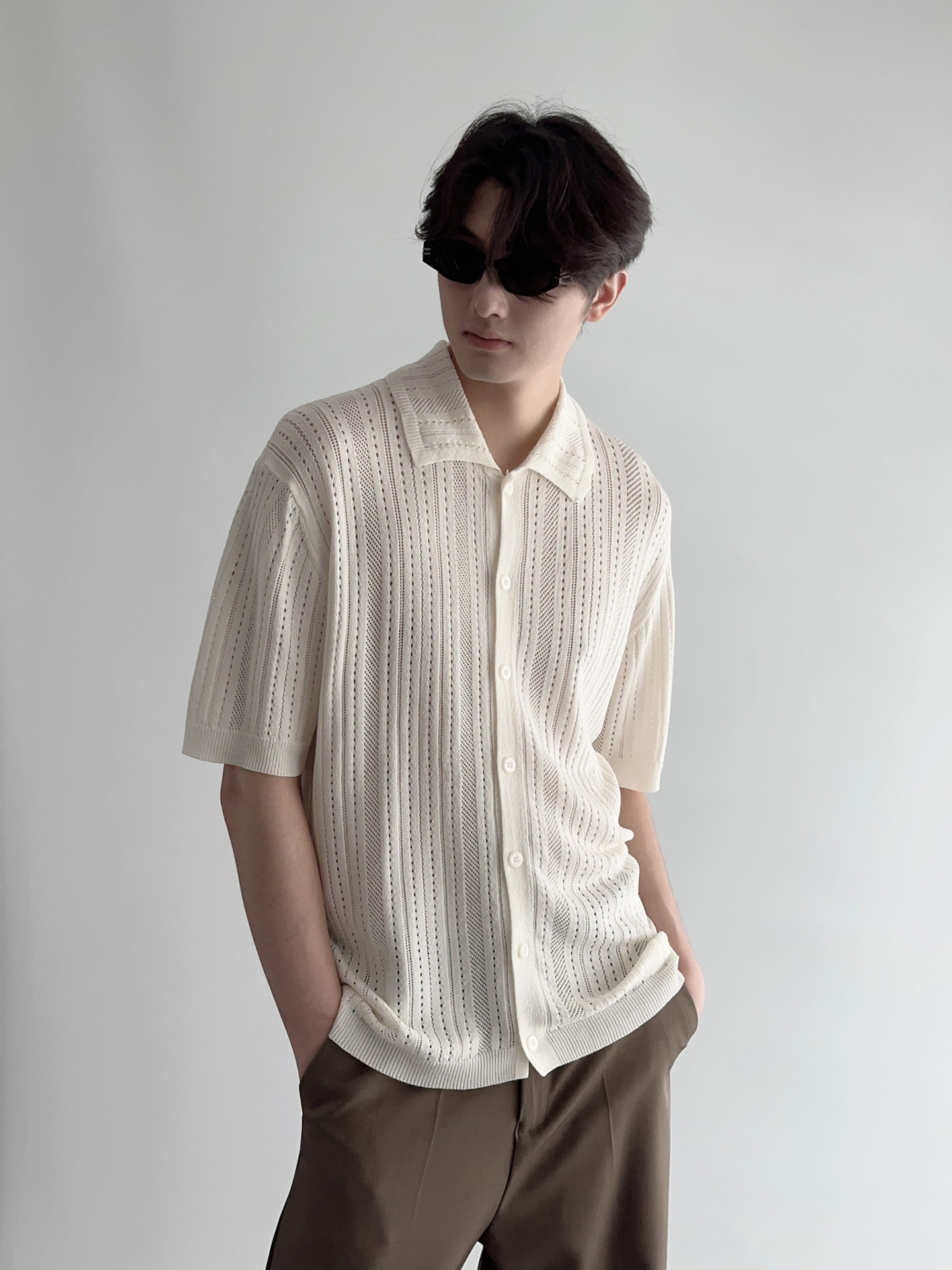 港风复古镂空针织短袖男年夏季新款休闲透气翻领宽松蕾丝衬衣