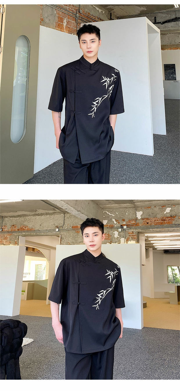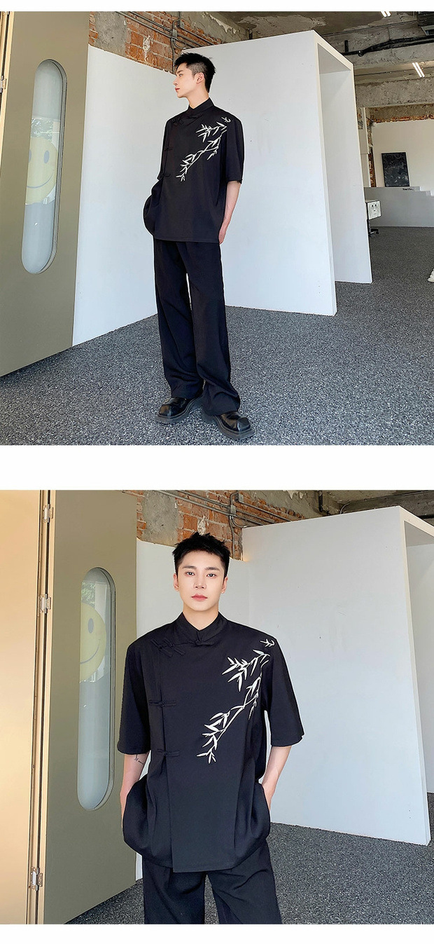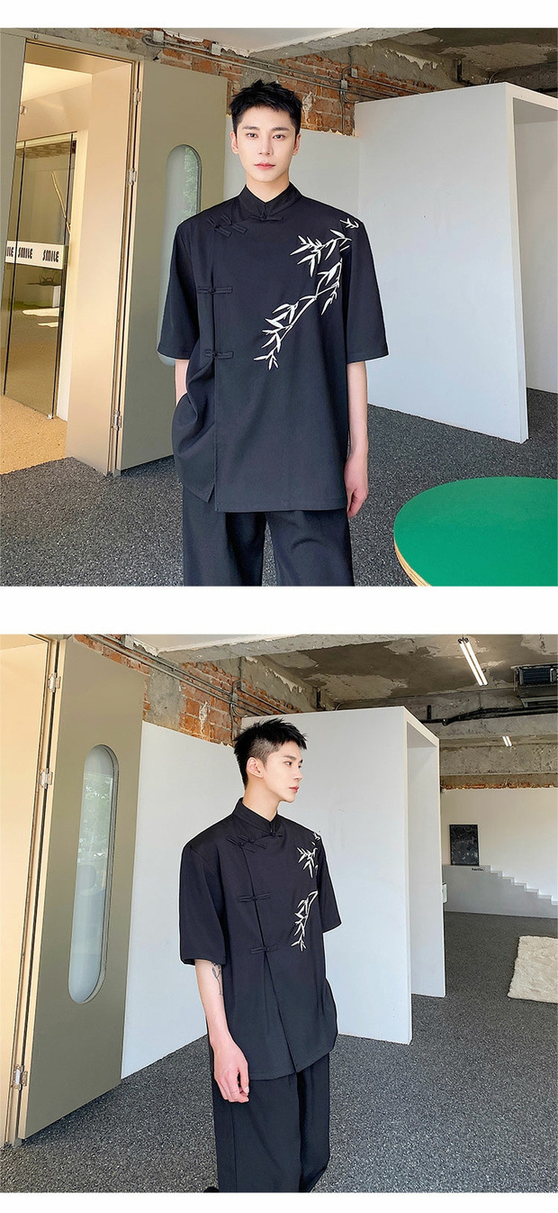 夏季改良新中式盘扣衬衫男短袖小众竹子刺绣设计感复古中国风衬衣