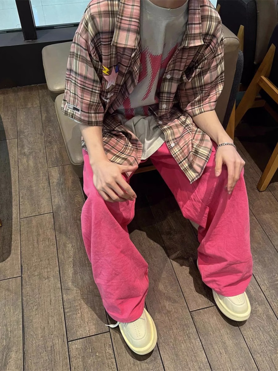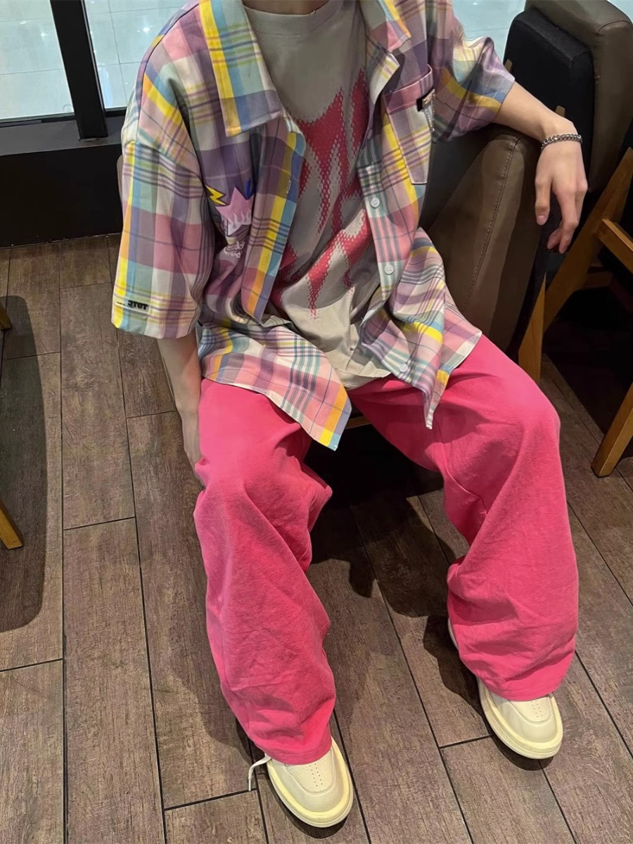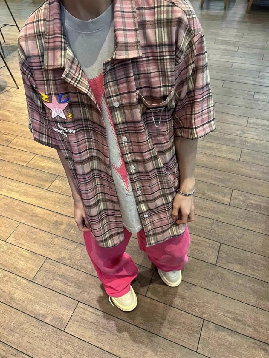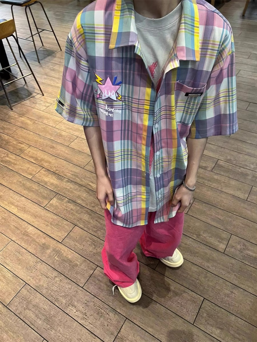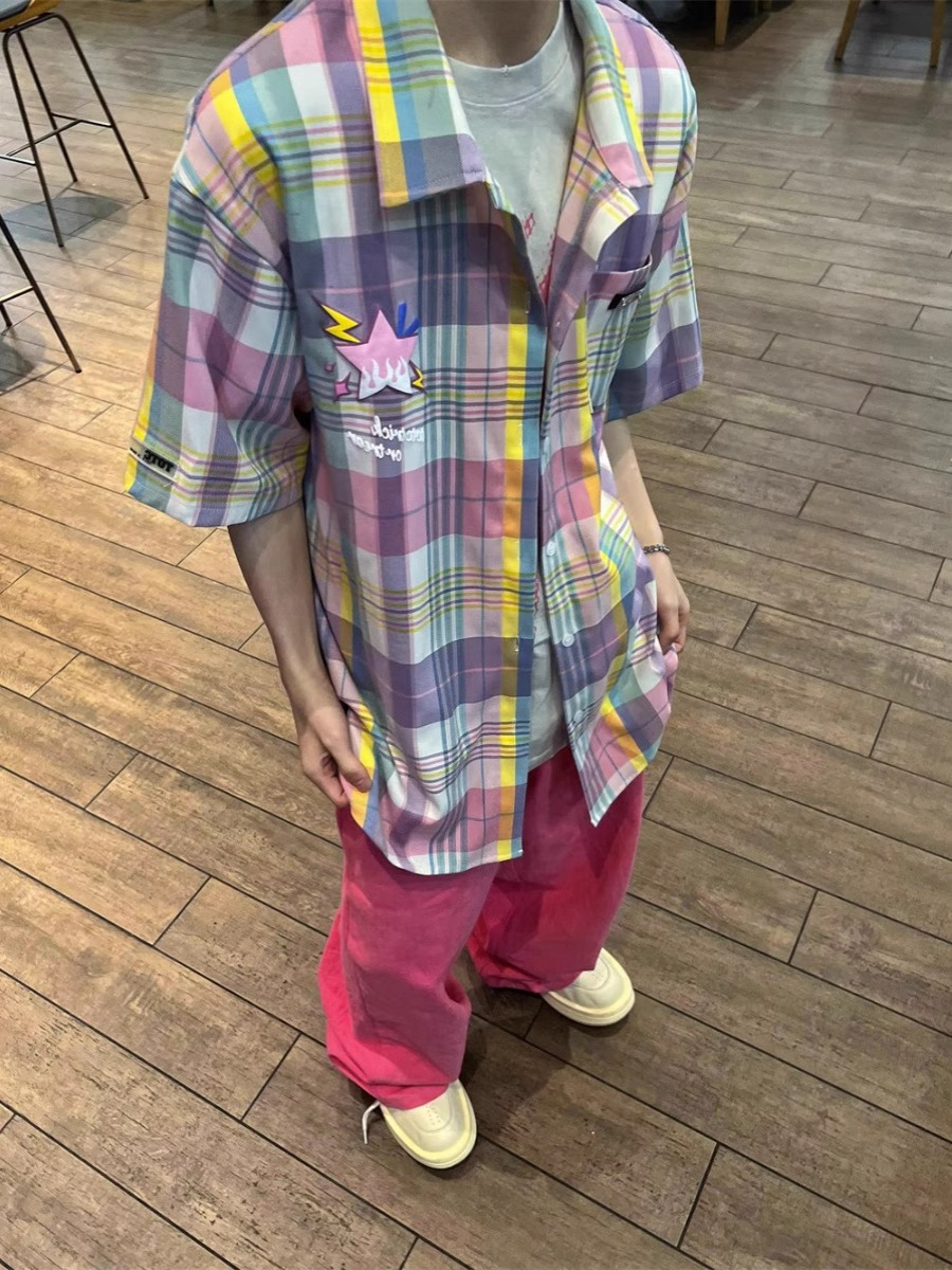 美式国潮复古彩色格子短袖衬衫男士百搭情侣宽松潮牌半袖衬衣夏季
