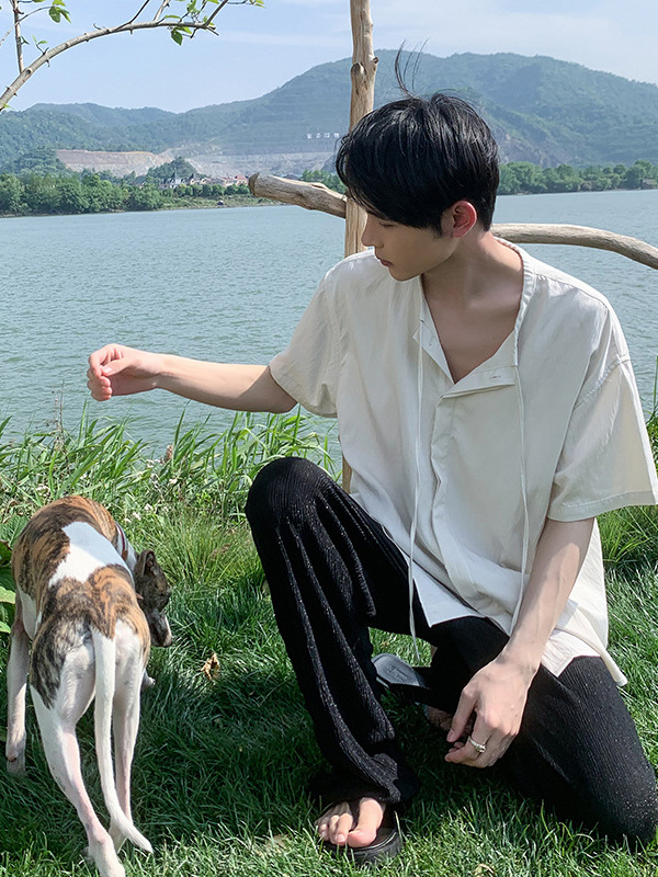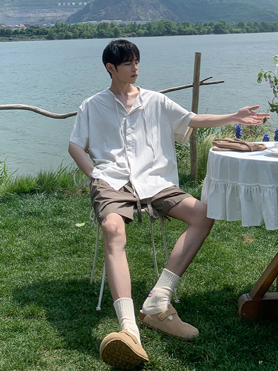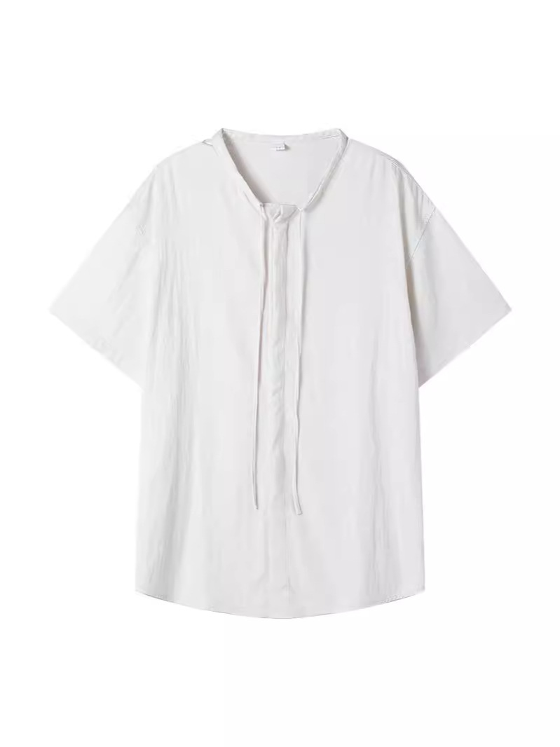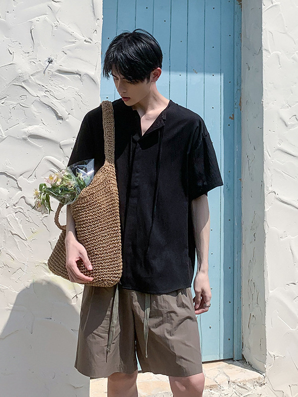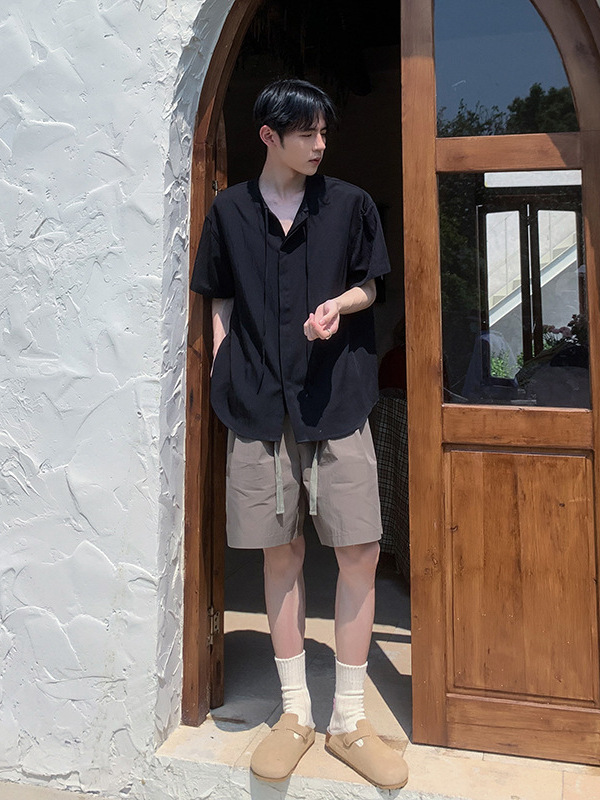 韩版小众无领纯色短袖衬衫年春夏季新款休闲宽松半袖衬衣上衣