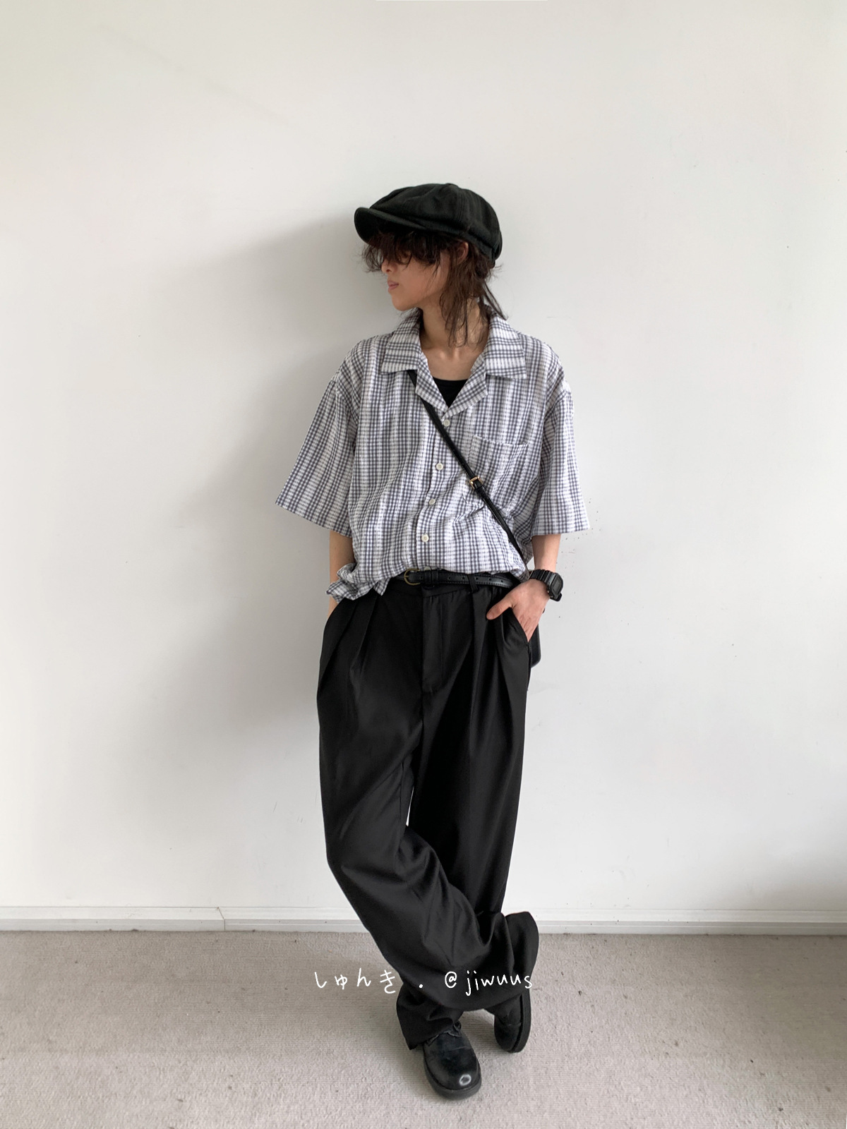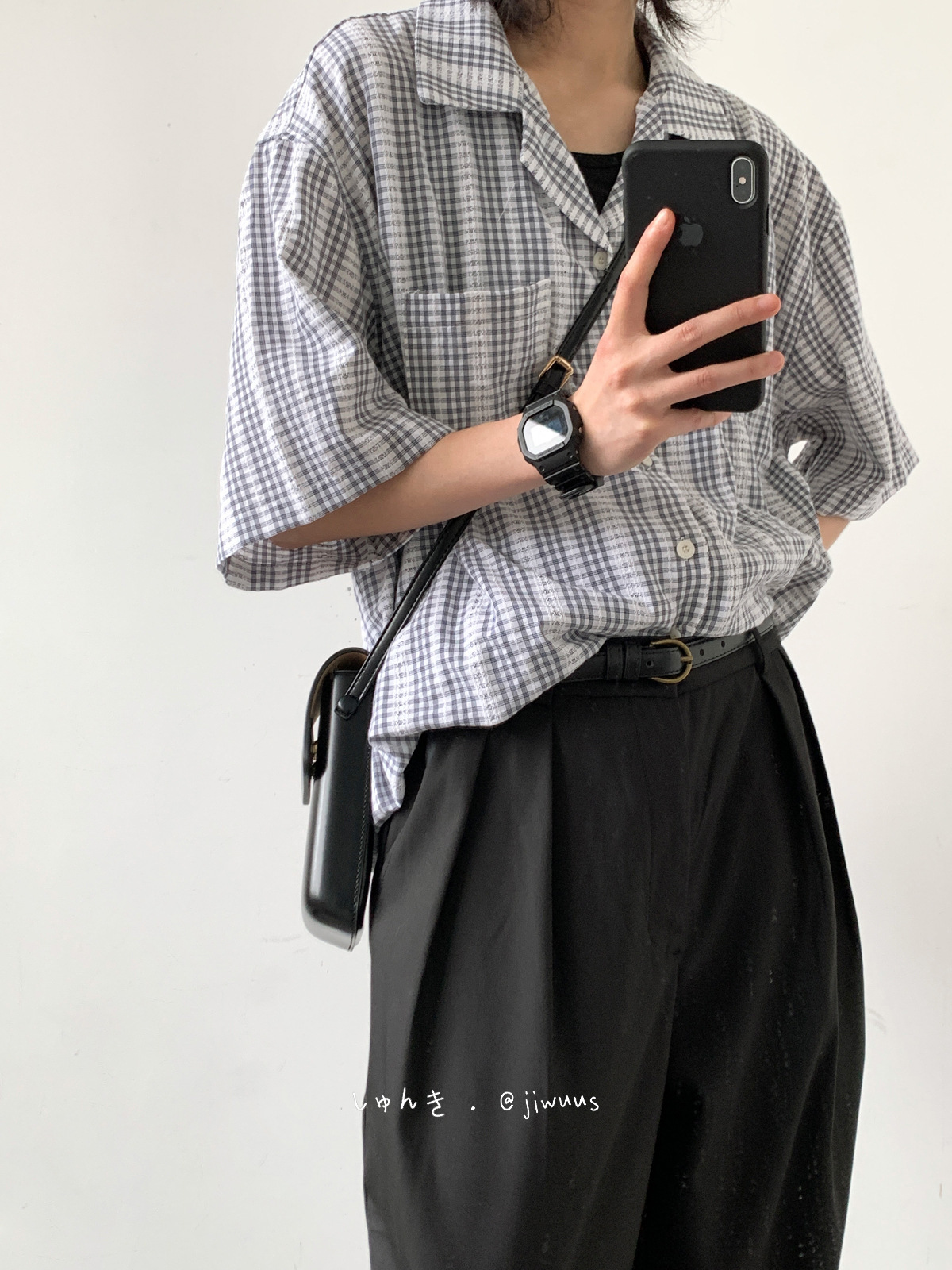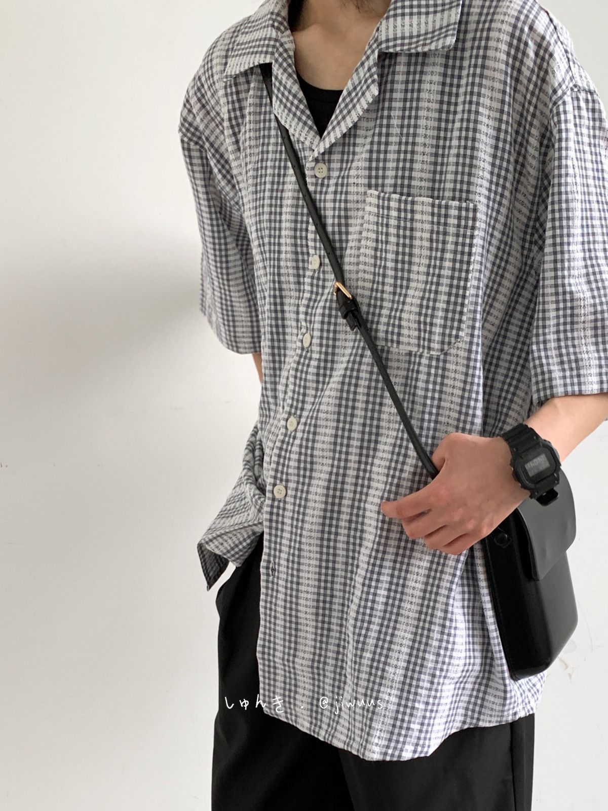 日系古巴领小格子衬衫男生春夏季新款学院风短袖小清新衬衣潮