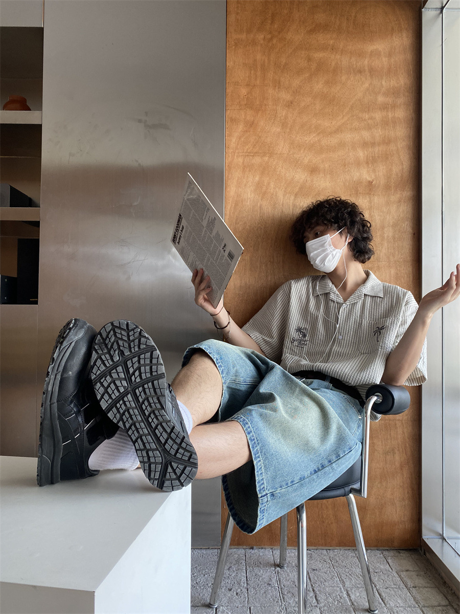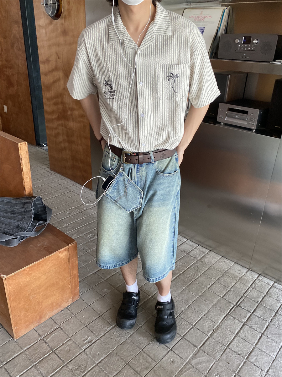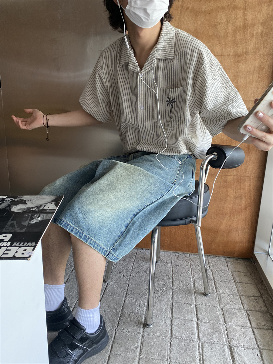 美式复古椰树刺绣古巴领条纹短袖衬衫男夏季新款翻领宽松休闲衬衣