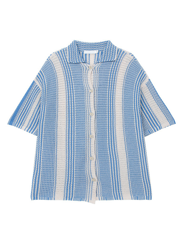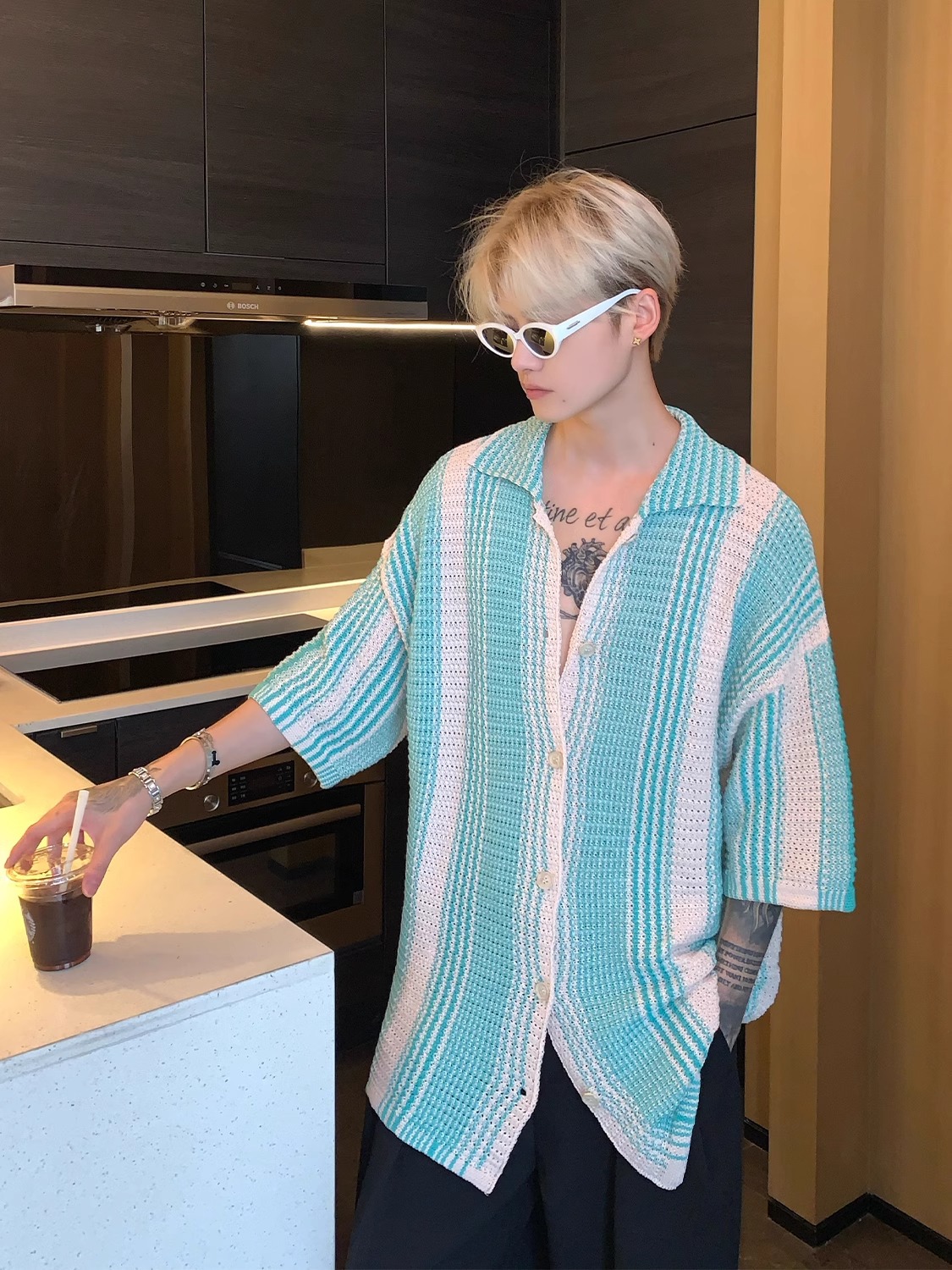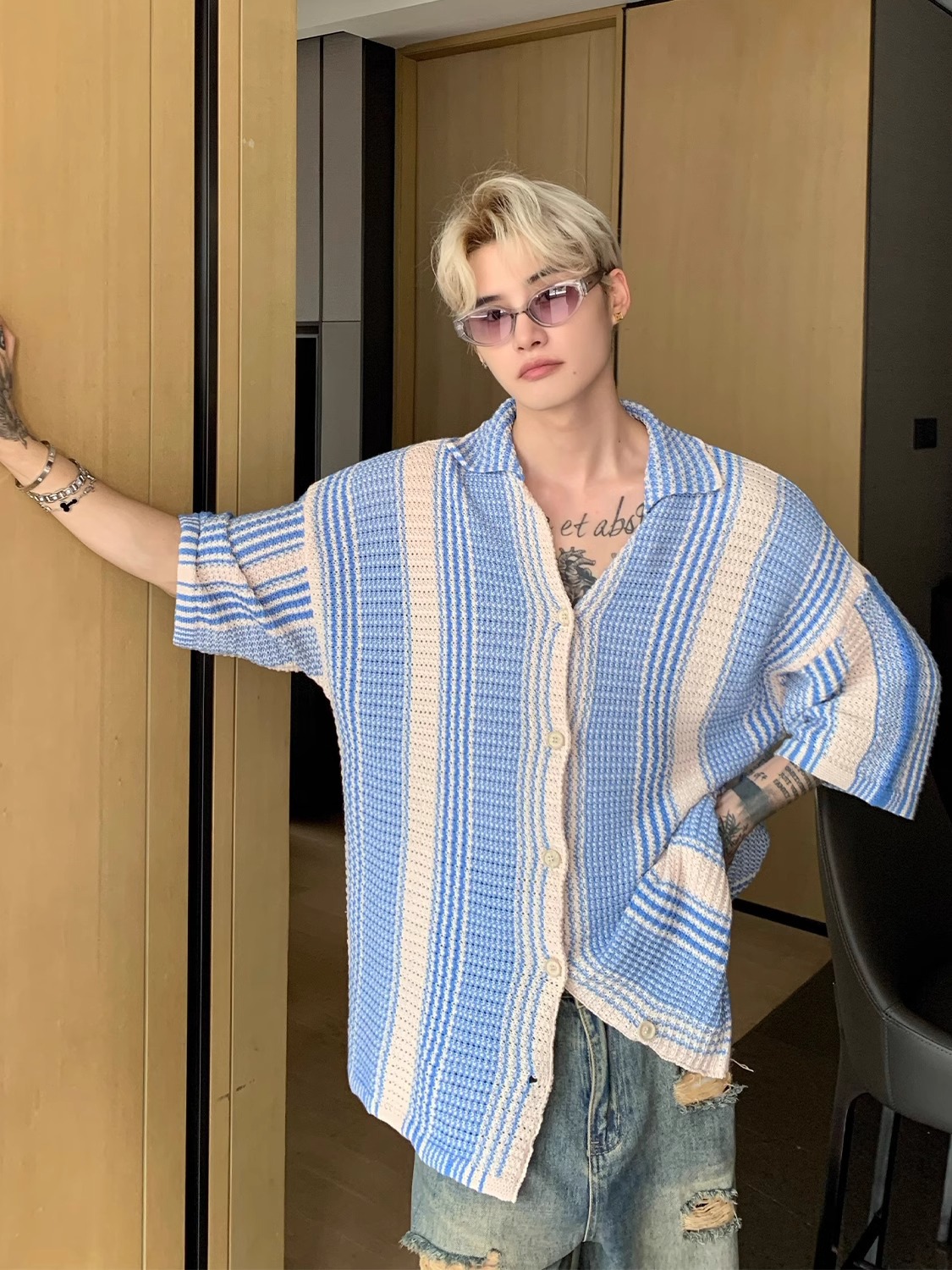 美式小众撞色短袖衬衫男夏季新款潮流宽松翻领休闲针织衫上衣