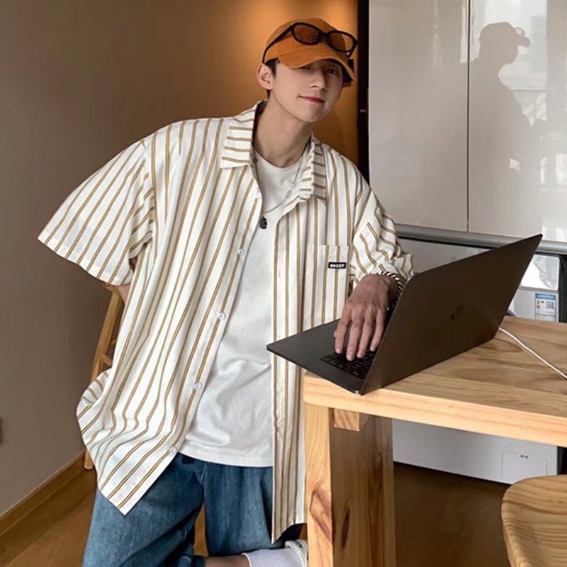 条纹短袖衬衫男夏季薄款港风日系衬衣外套ins潮流设计感小众上衣