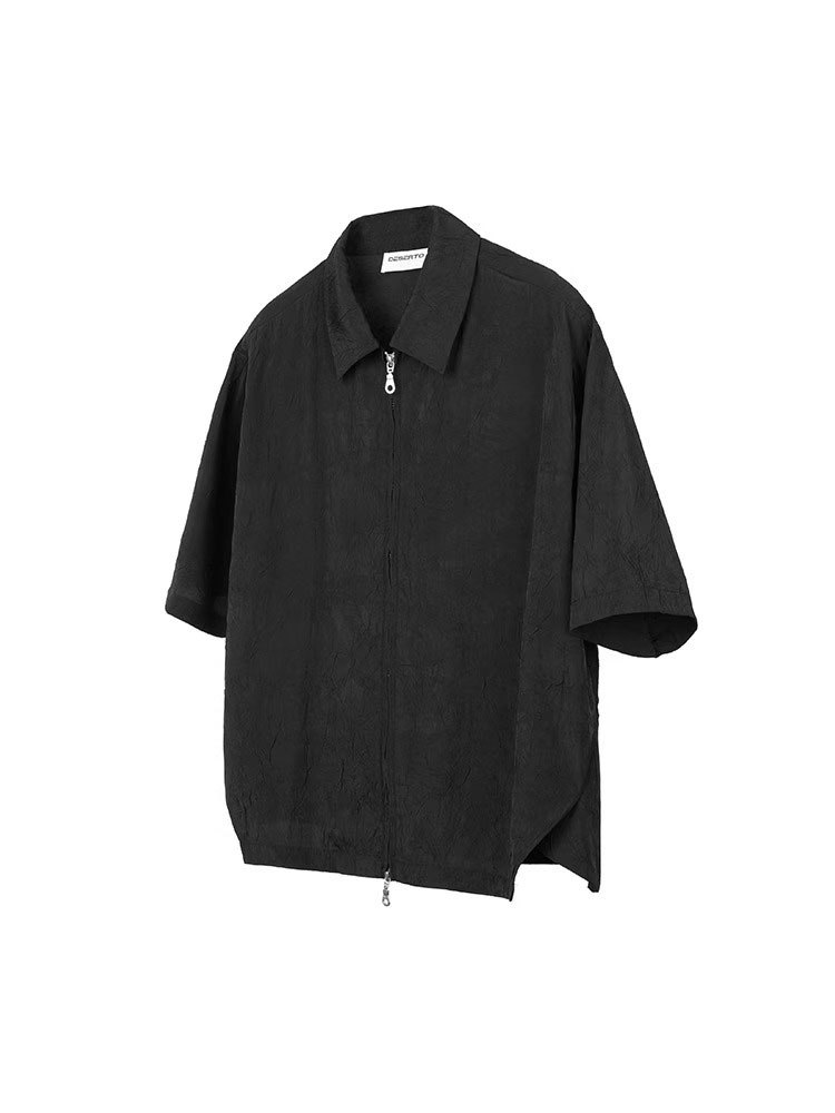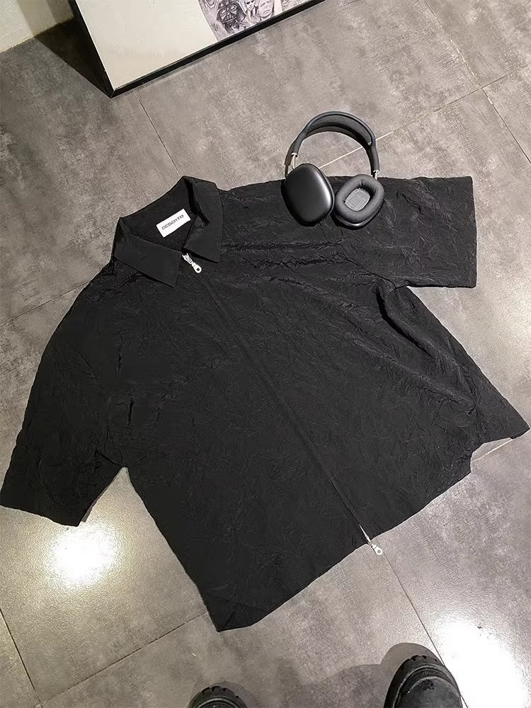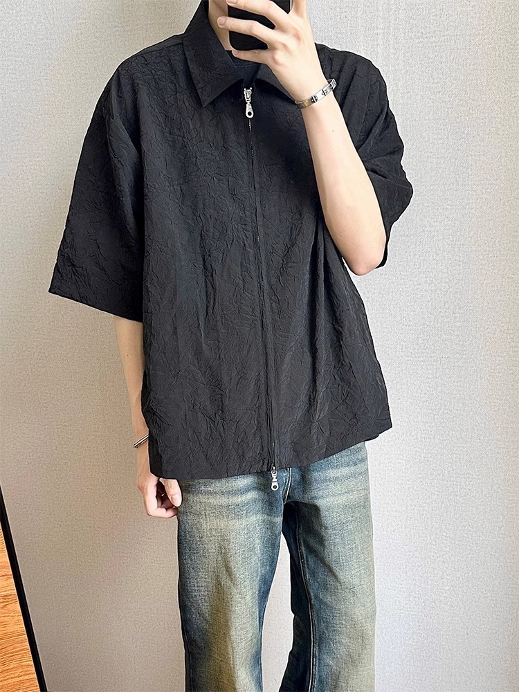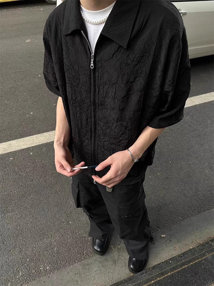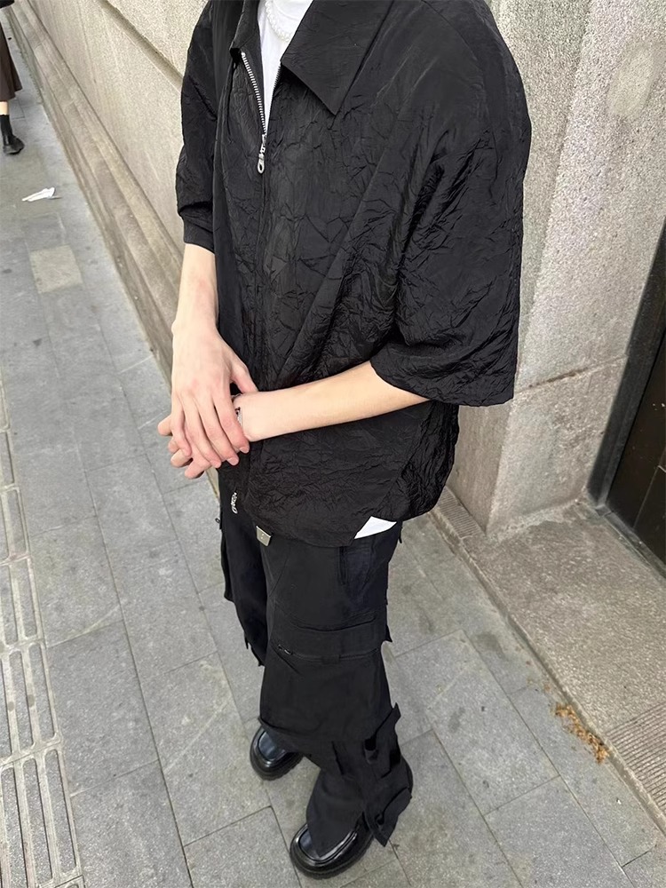 褶皱纹理解构拉链翻领衬衫男年夏季新款小众cleanfit休闲上衣