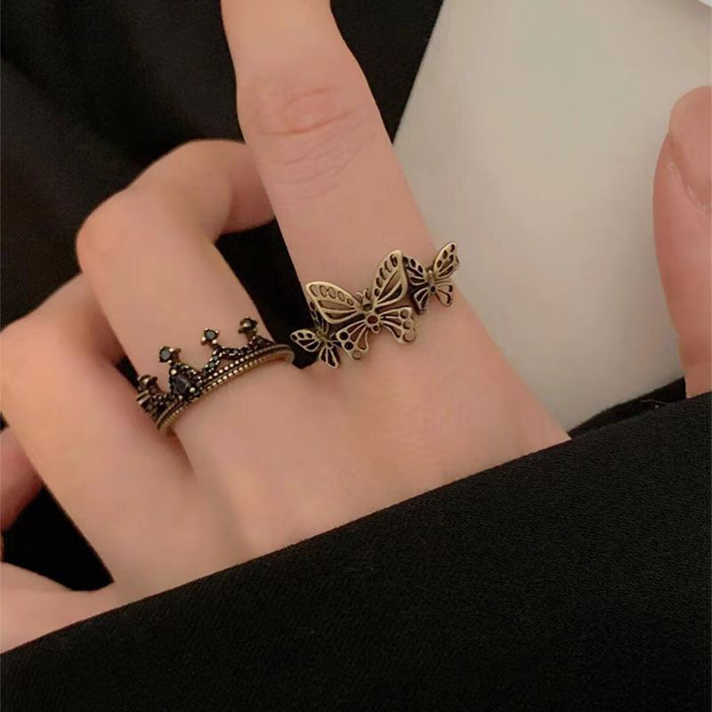 暗黑系复古做旧镂空蝴蝶戒指女朋克风水滴皇冠食指戒