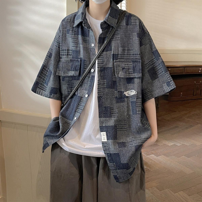 夏季牛仔短袖衬衫男潮牌宽松复古五分袖ins港风休闲格子衬衣外套