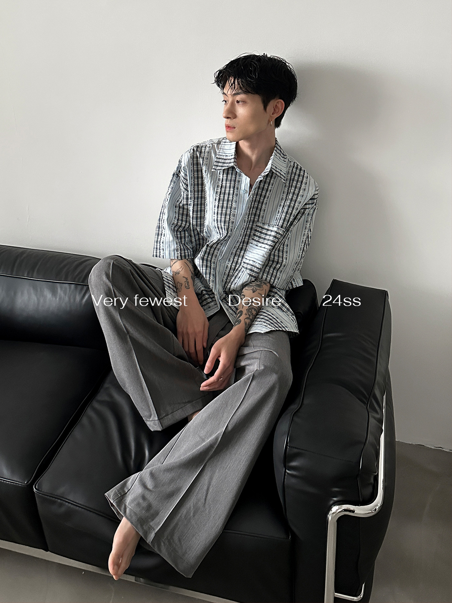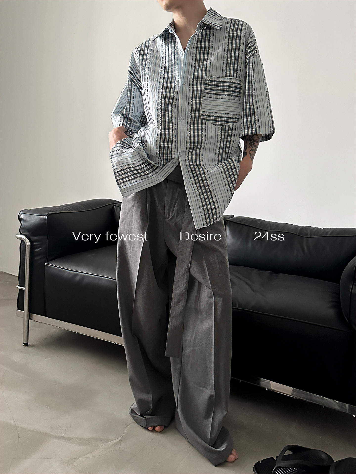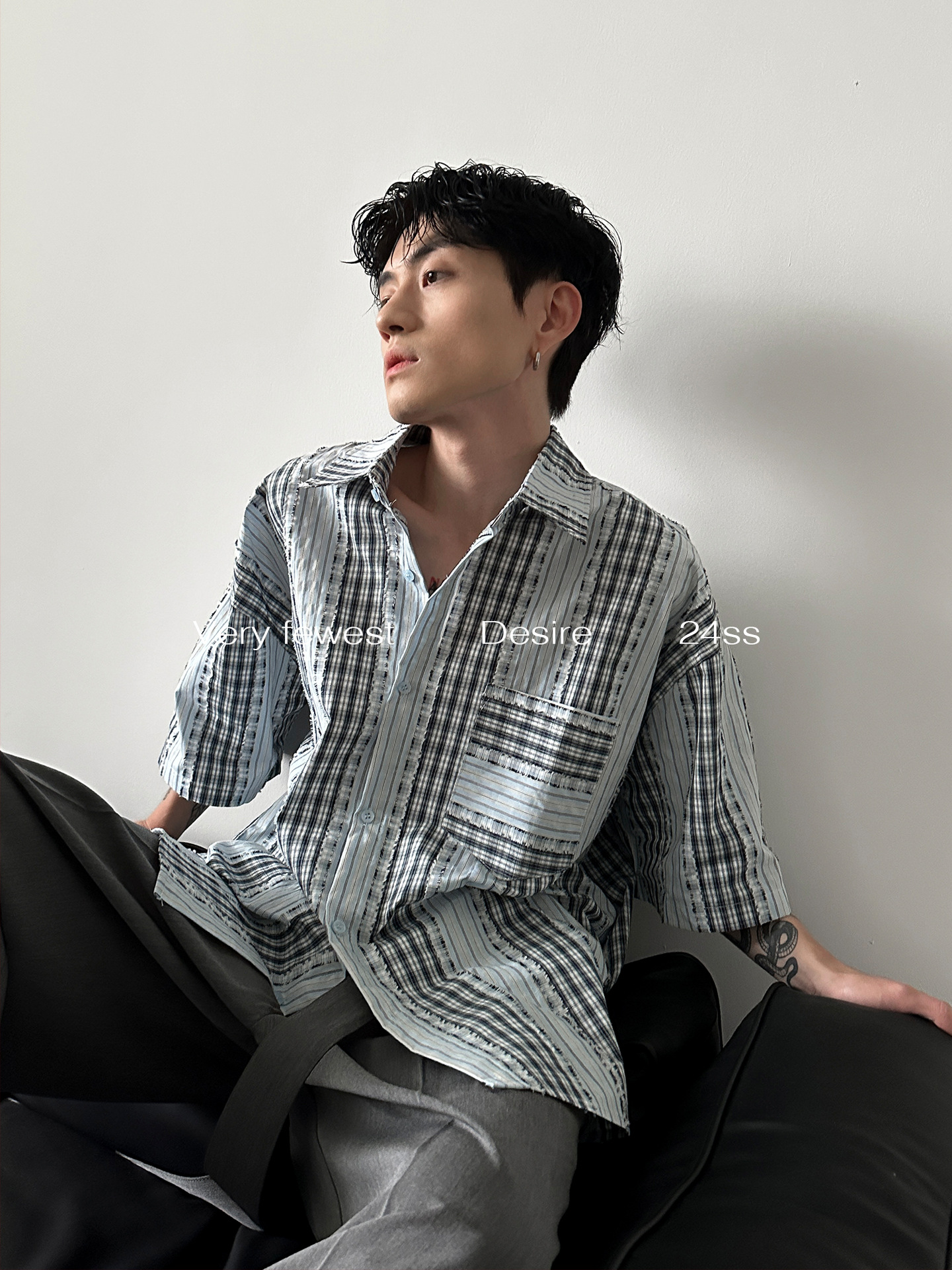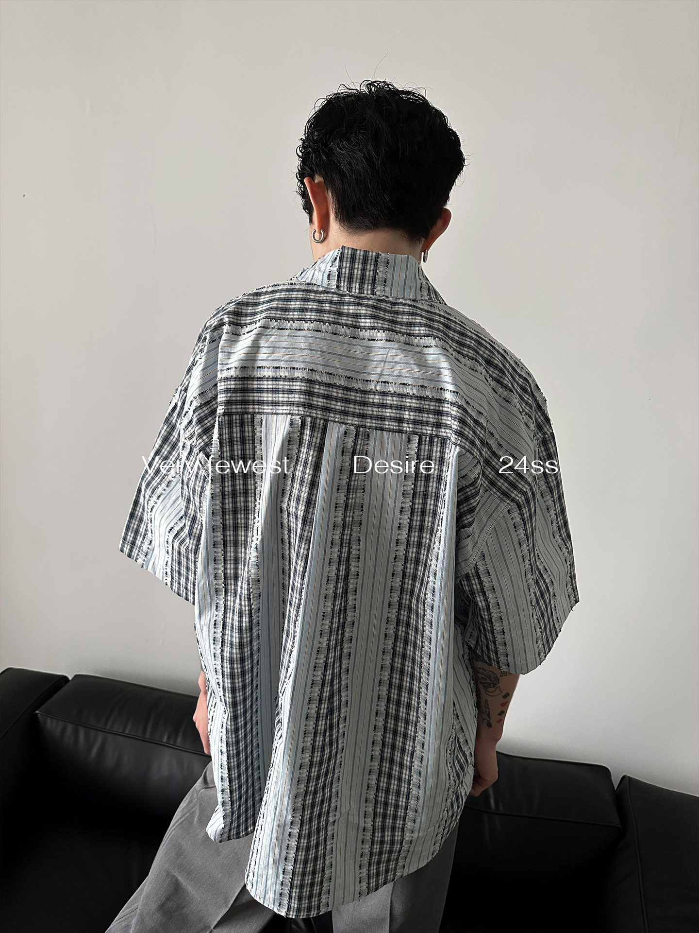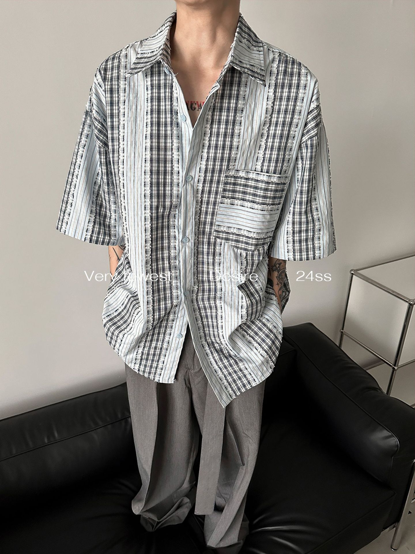小众无性别格子拼接条纹廓形短袖衬衫春夏季新款水洗毛边衬衣上衣