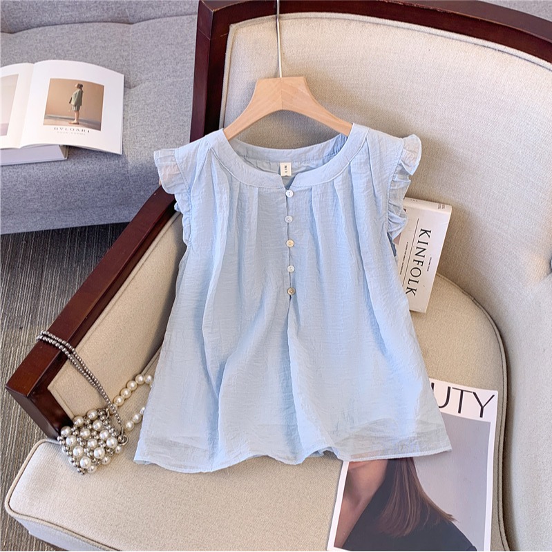 韩系蓝色木耳边无袖衬衫女夏季法式圆领压褶衬衣别致小飞袖上衣服
