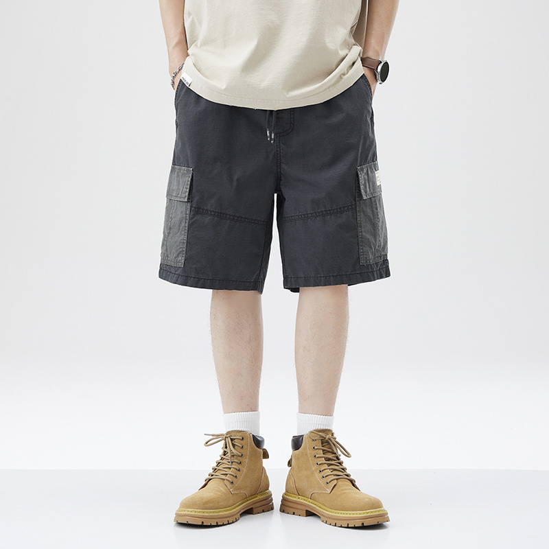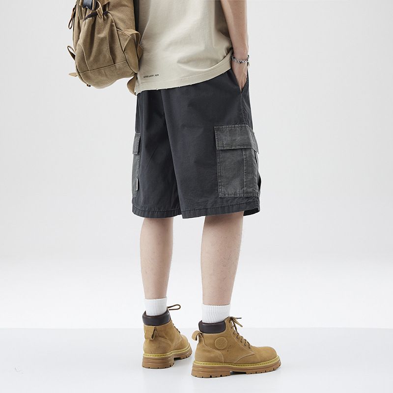 美式潮牌工装短裤男士夏季宽松休闲纯棉中裤拼接撞色大口袋五分裤
