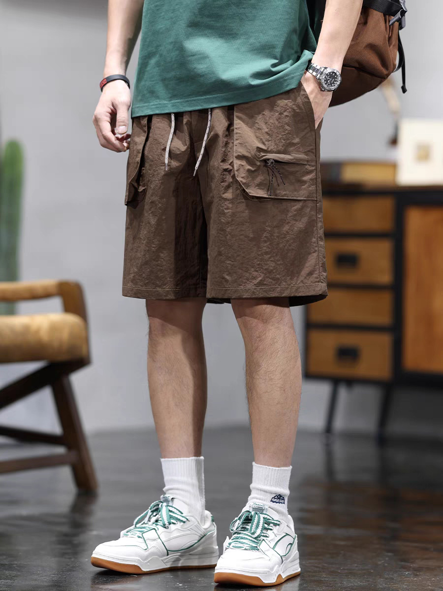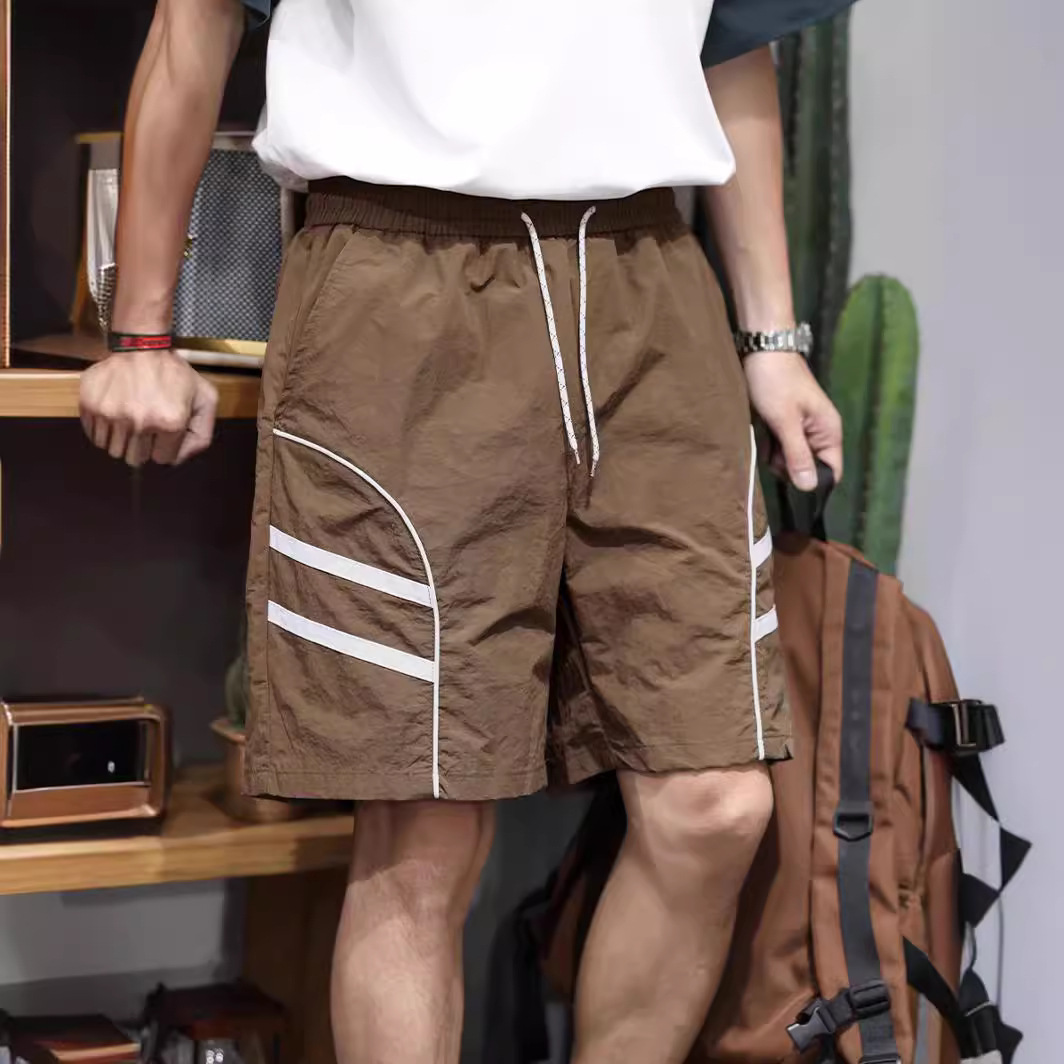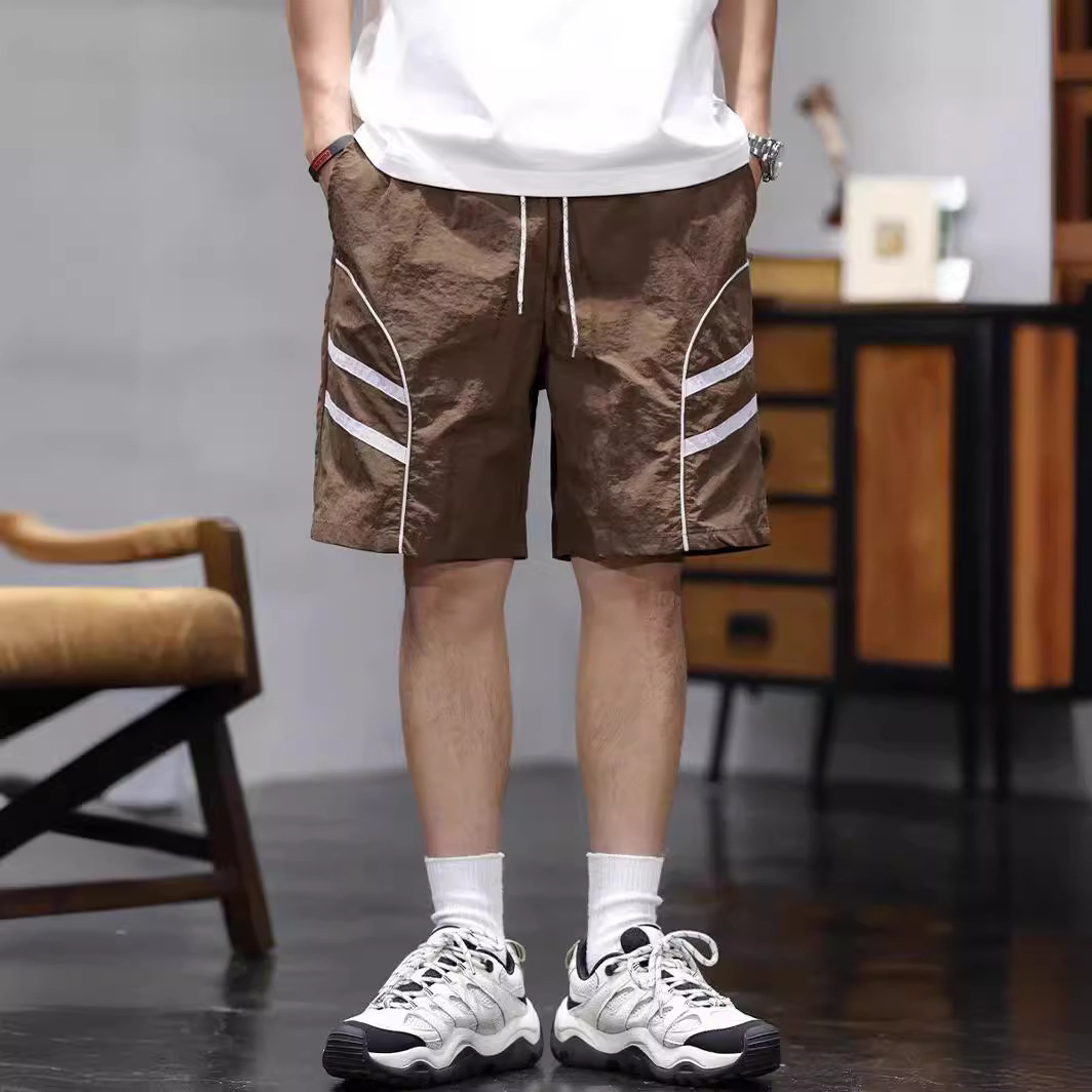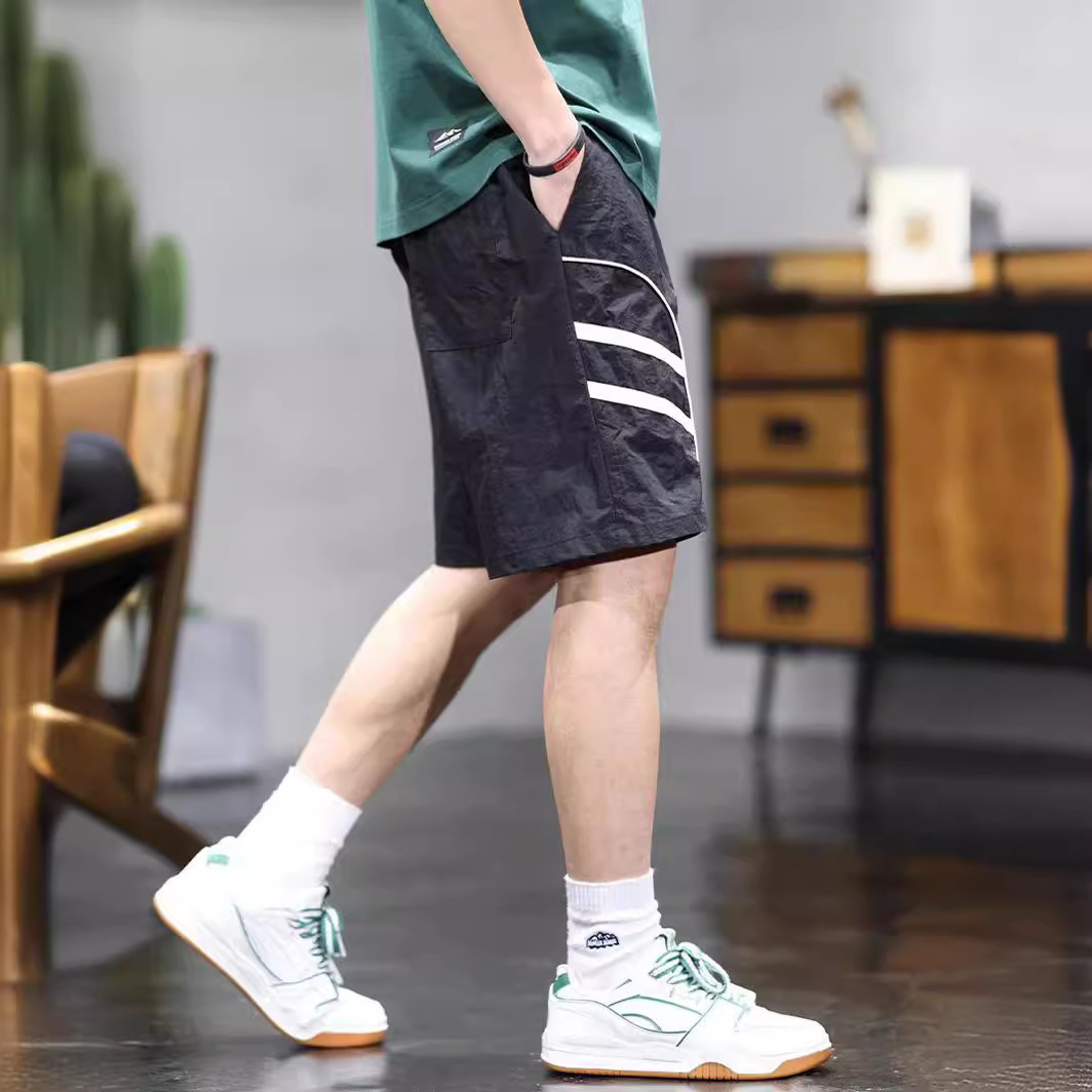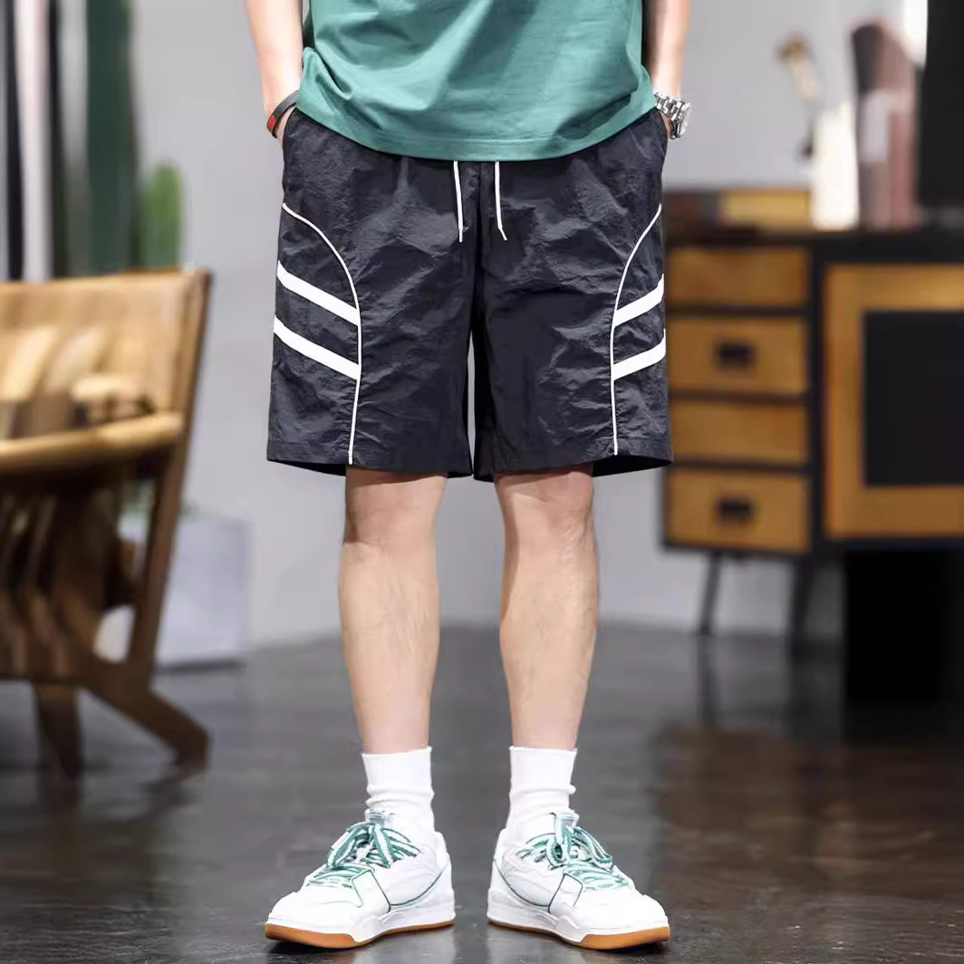 夏季薄款冰丝速干休闲短裤男士新款宽松潮牌条纹拼接直筒五分裤子