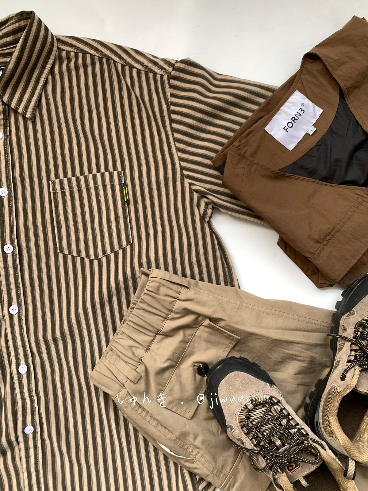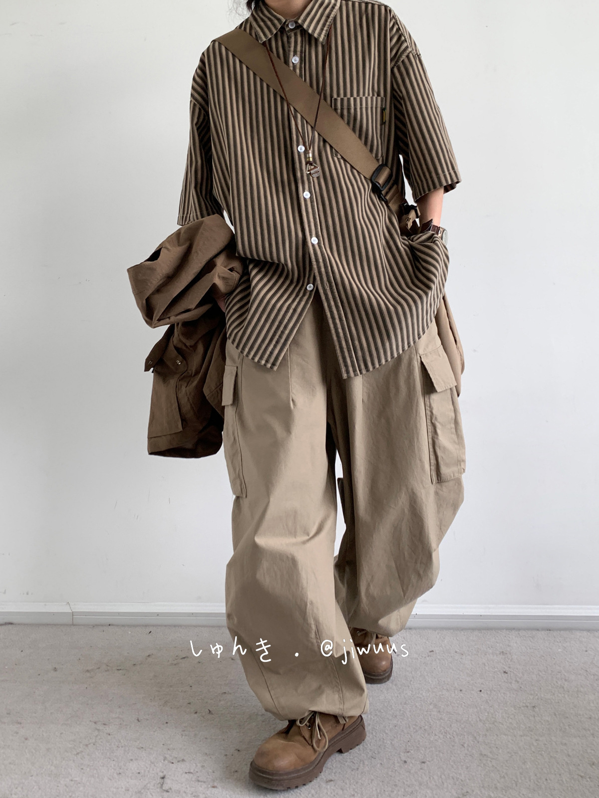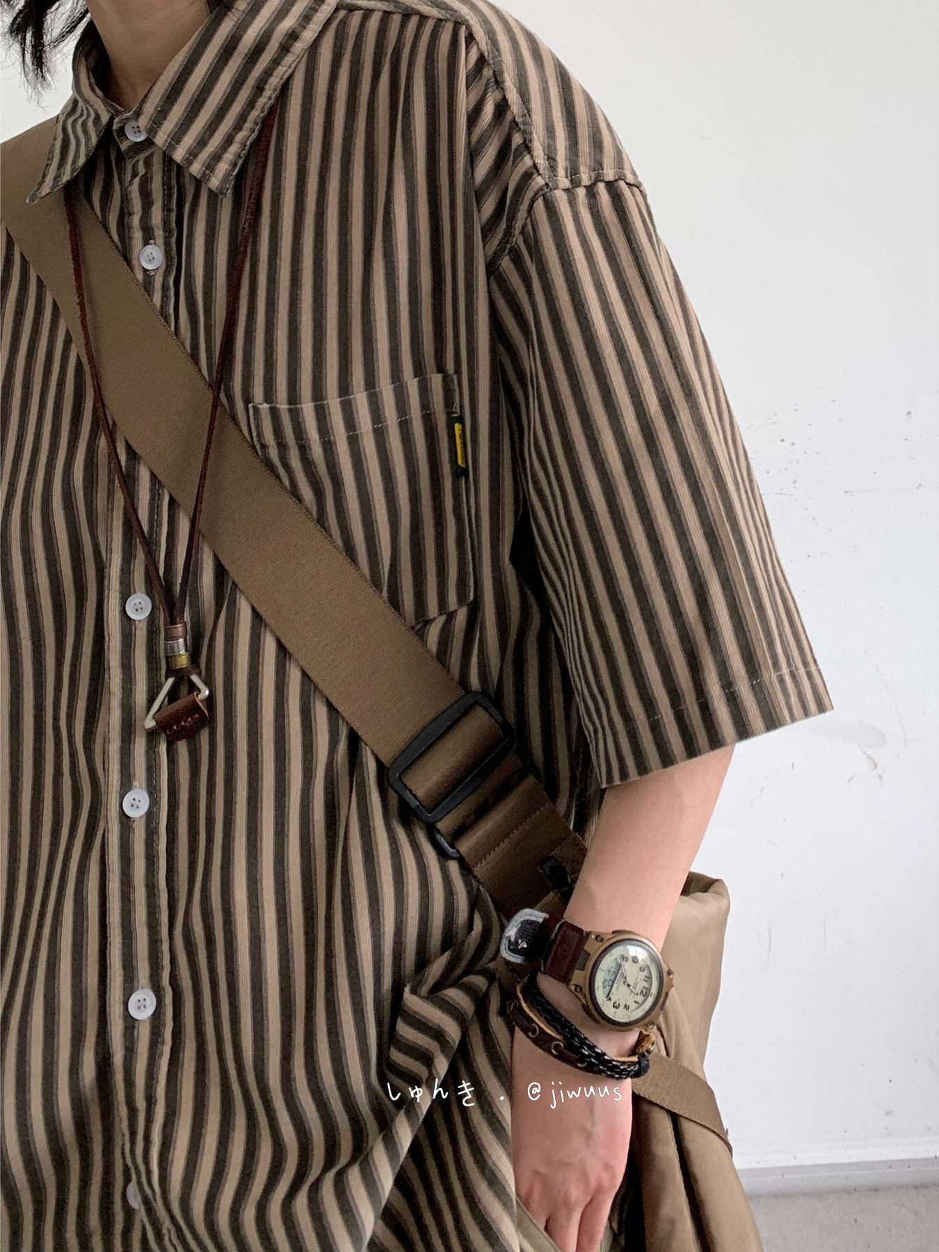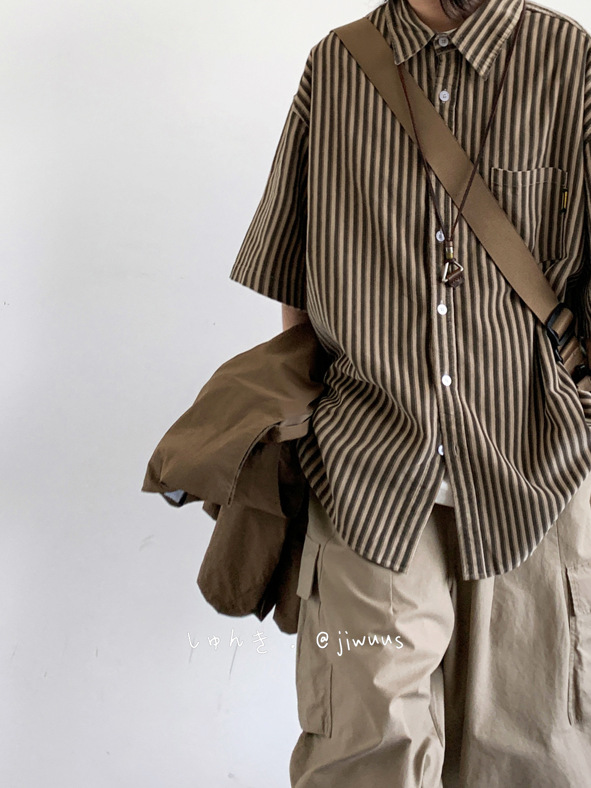日系复古小众原宿风条纹短袖衬衫男生夏季新款宽松男友风工装衬衣