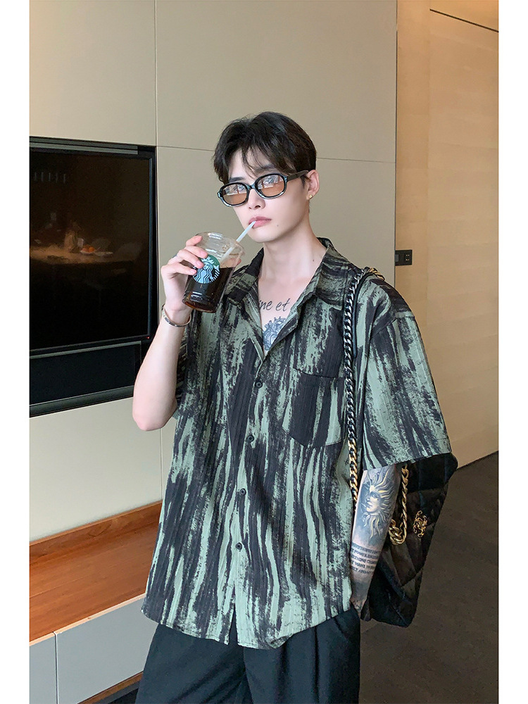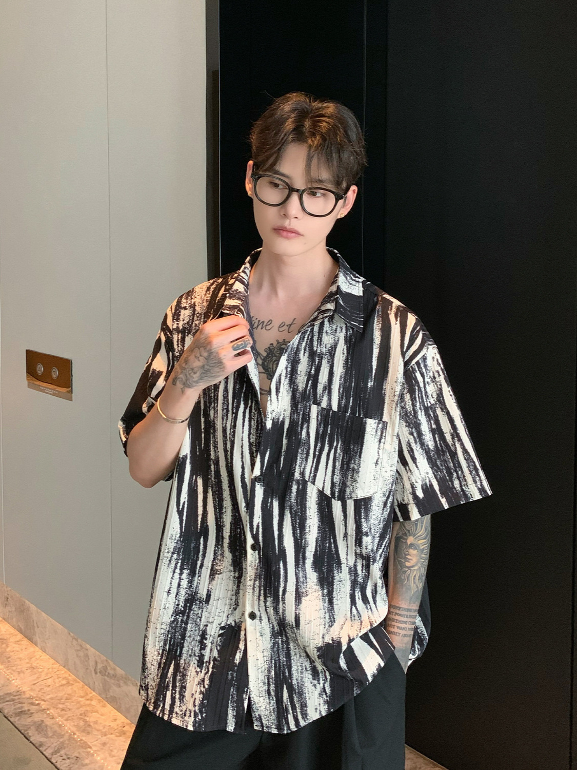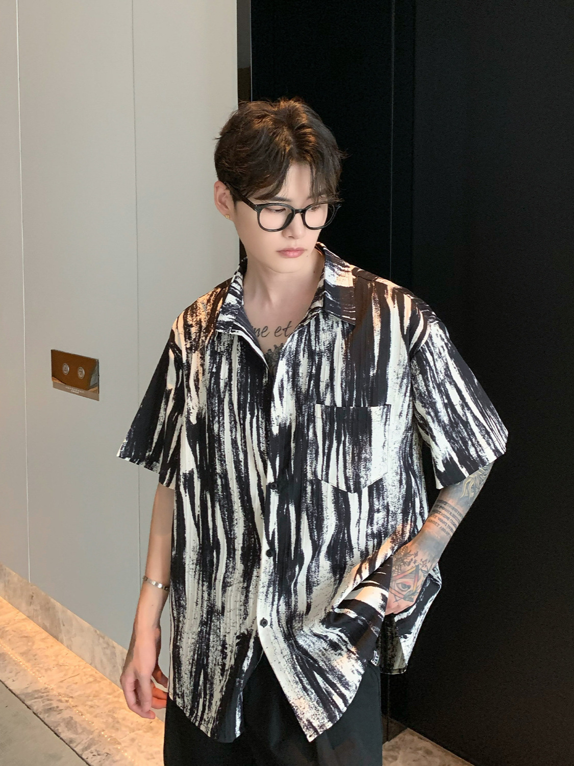 小众复古泼墨设计感短袖衬衫男夏季新款宽松痞帅高级衬衣上衣