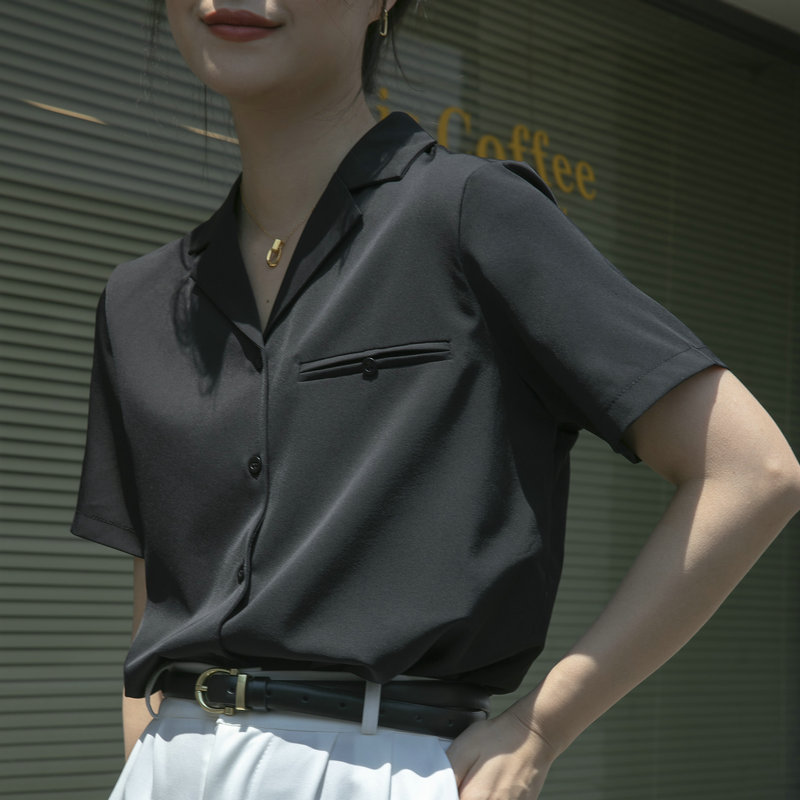 黑色衬衣女夏季新款雪纺短袖上衣春港风设计感小众v领衬衫