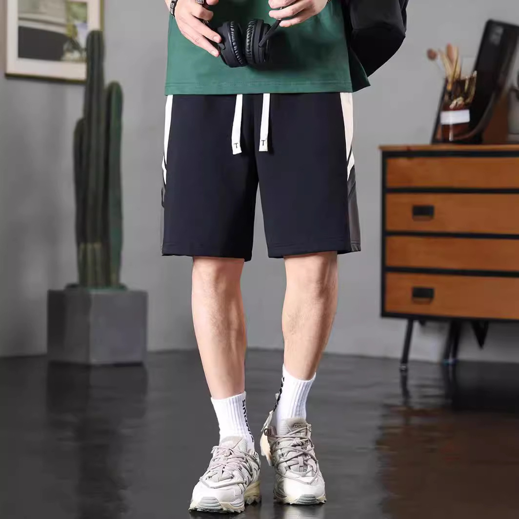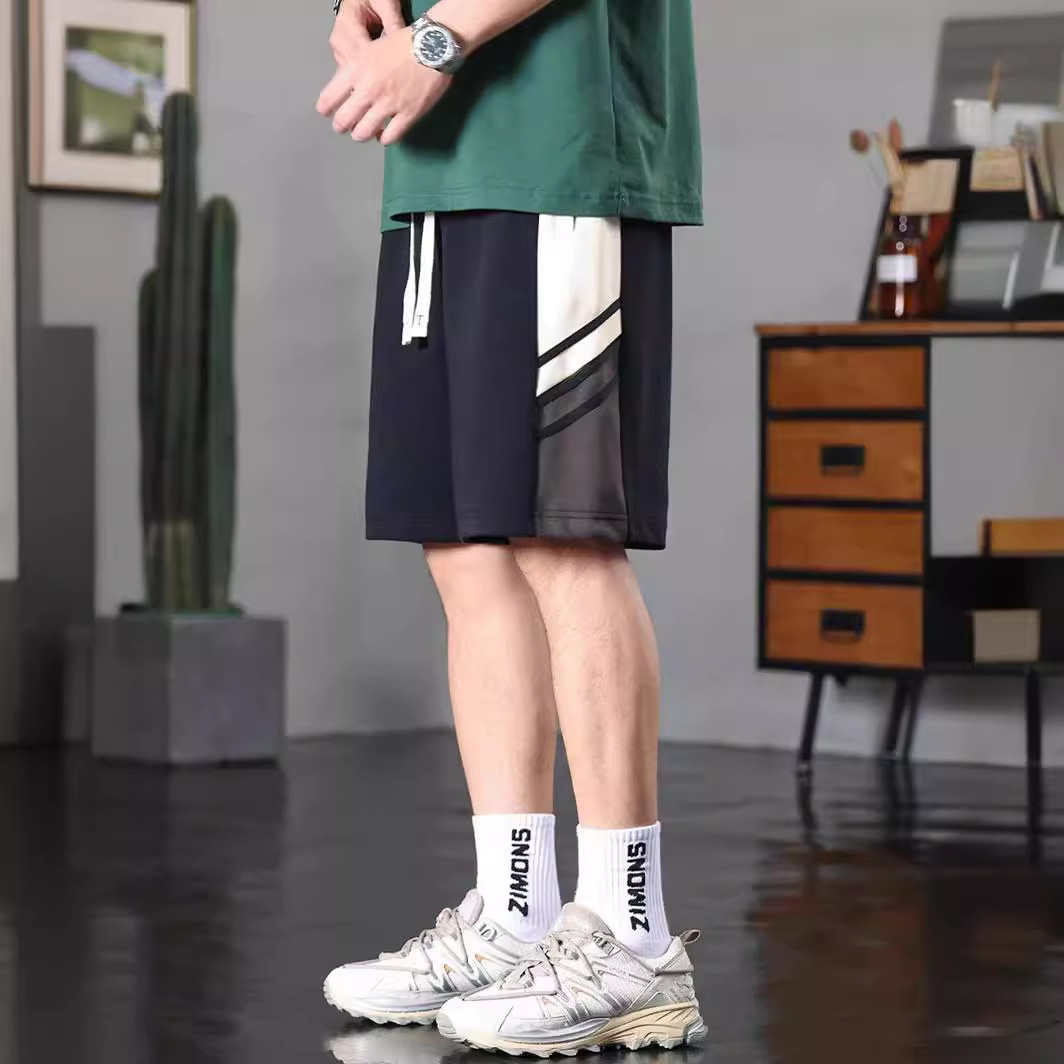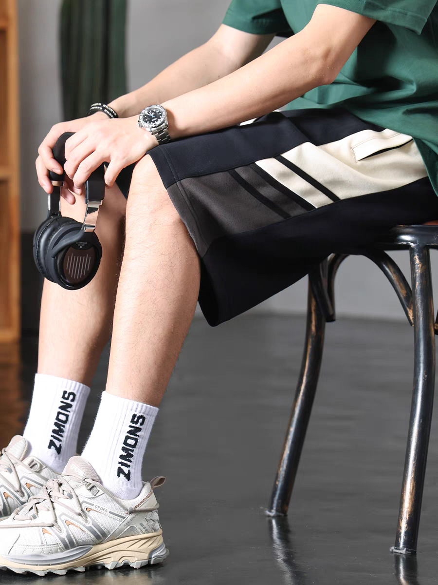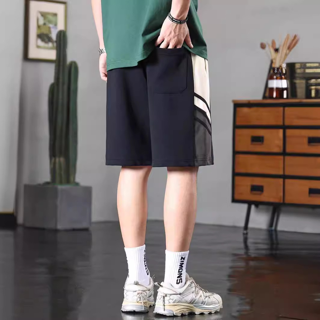 潮牌拼接撞色休闲短裤男士夏季跑步运动中裤宽松直筒针织五分裤男