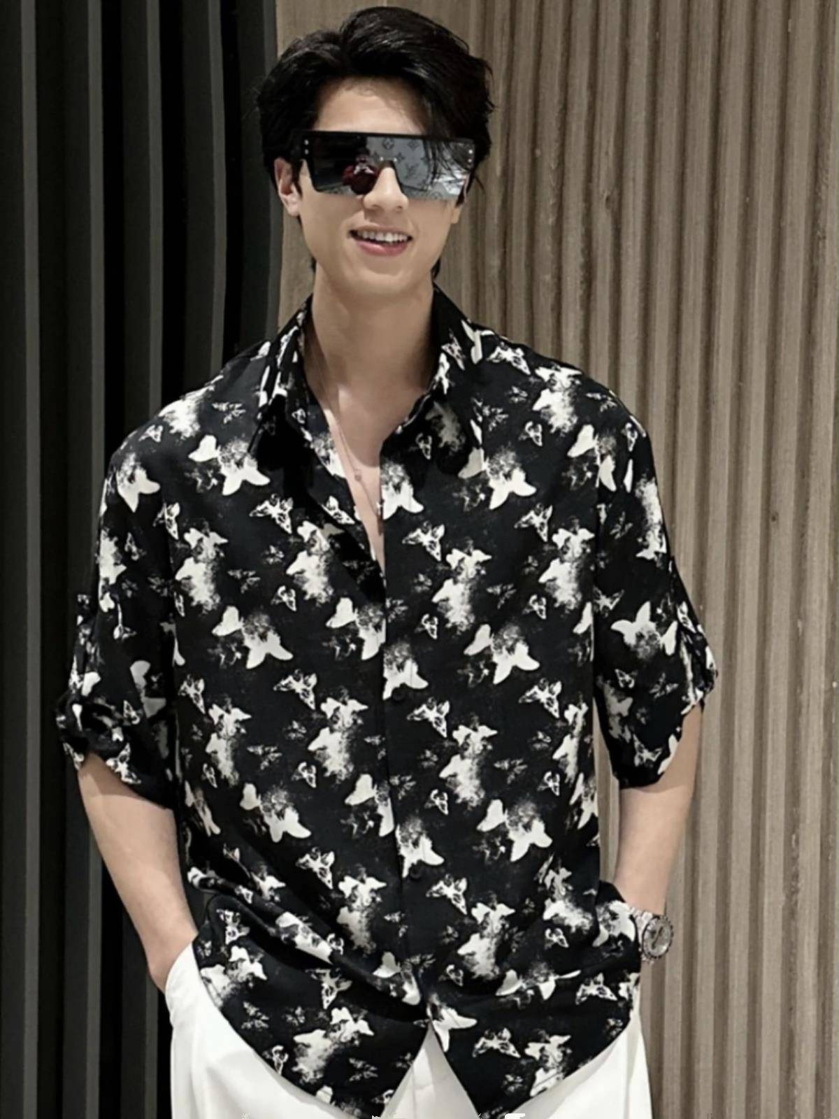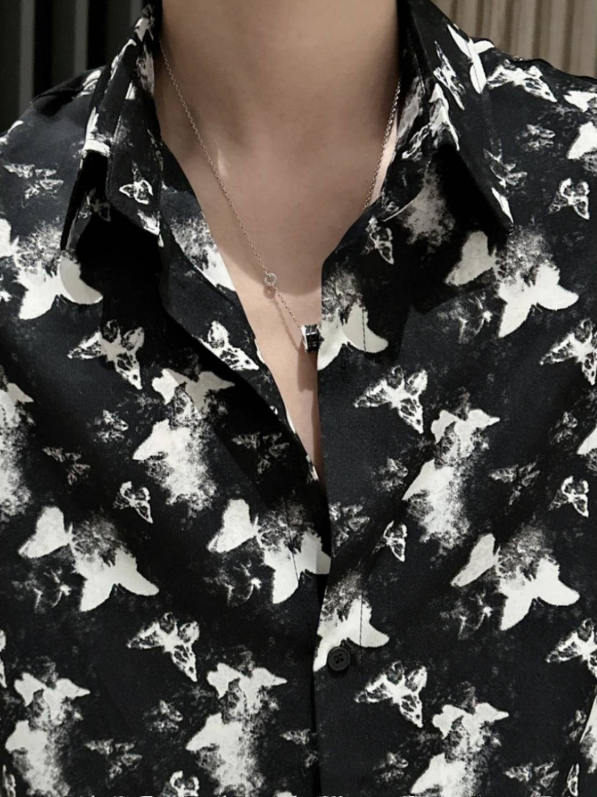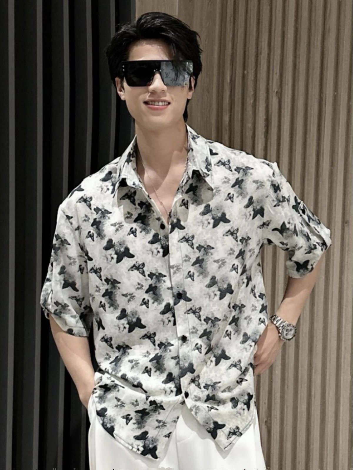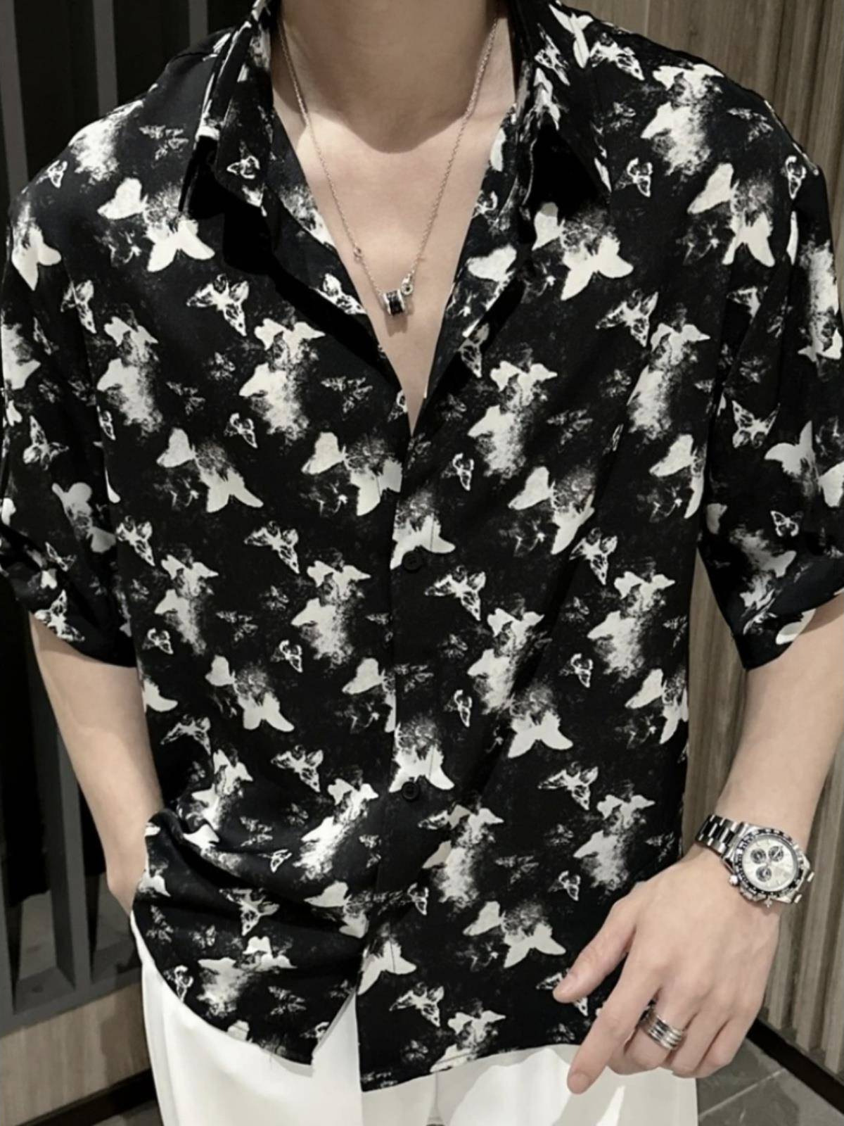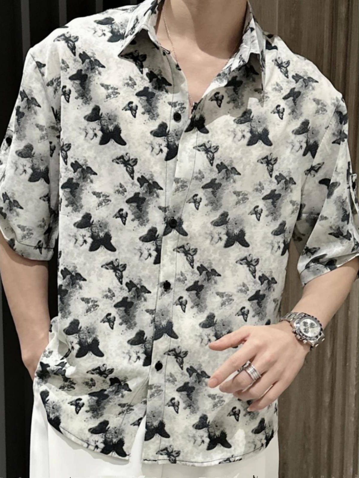 冰丝花衬衫男夏季新款高级感穿搭痞帅蝴蝶印花衣服男款七分袖衬衣