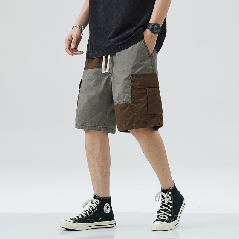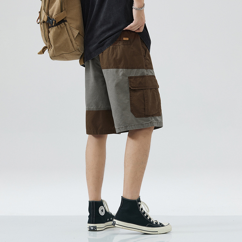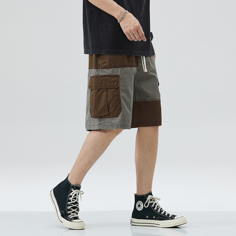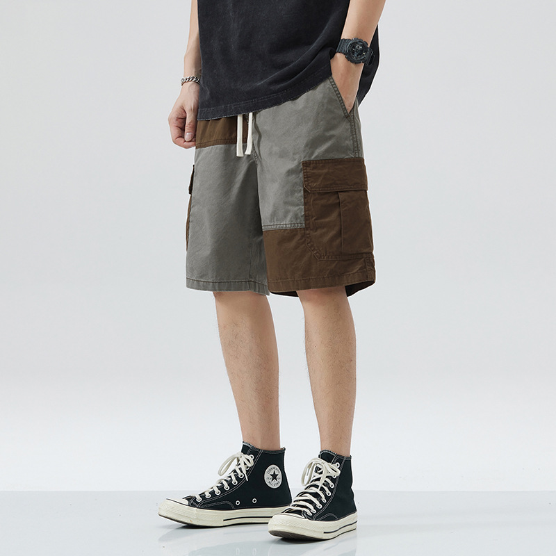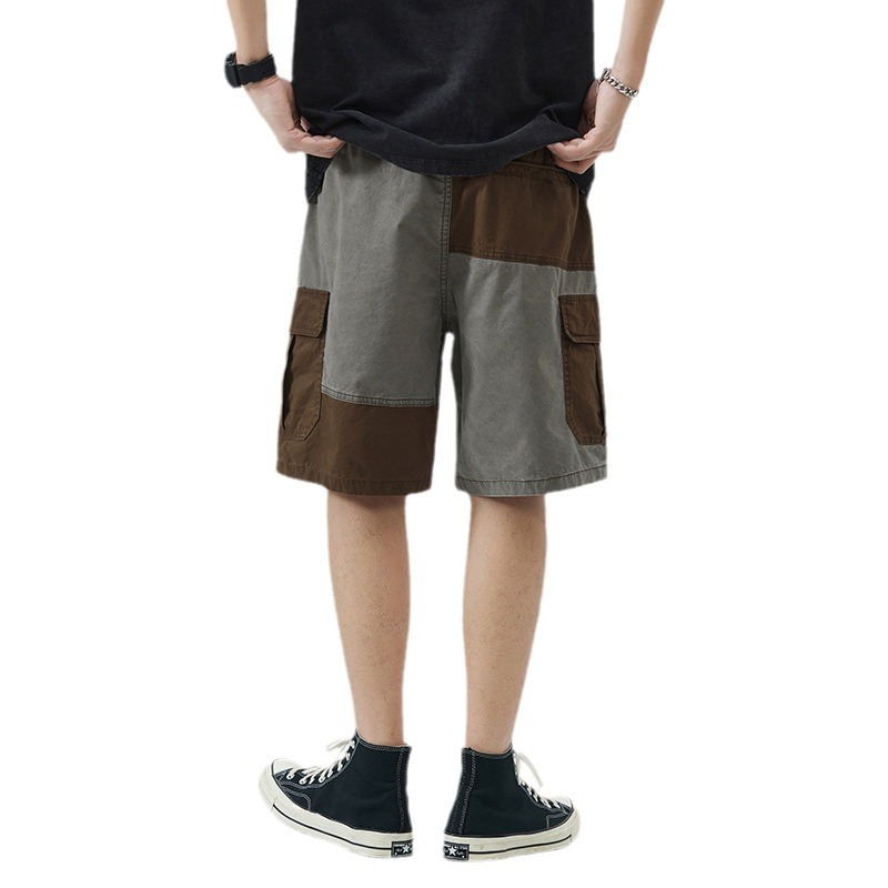 夏季新款拼接撞色工装短裤男宽松大码纯棉直筒五分裤美式休闲中裤