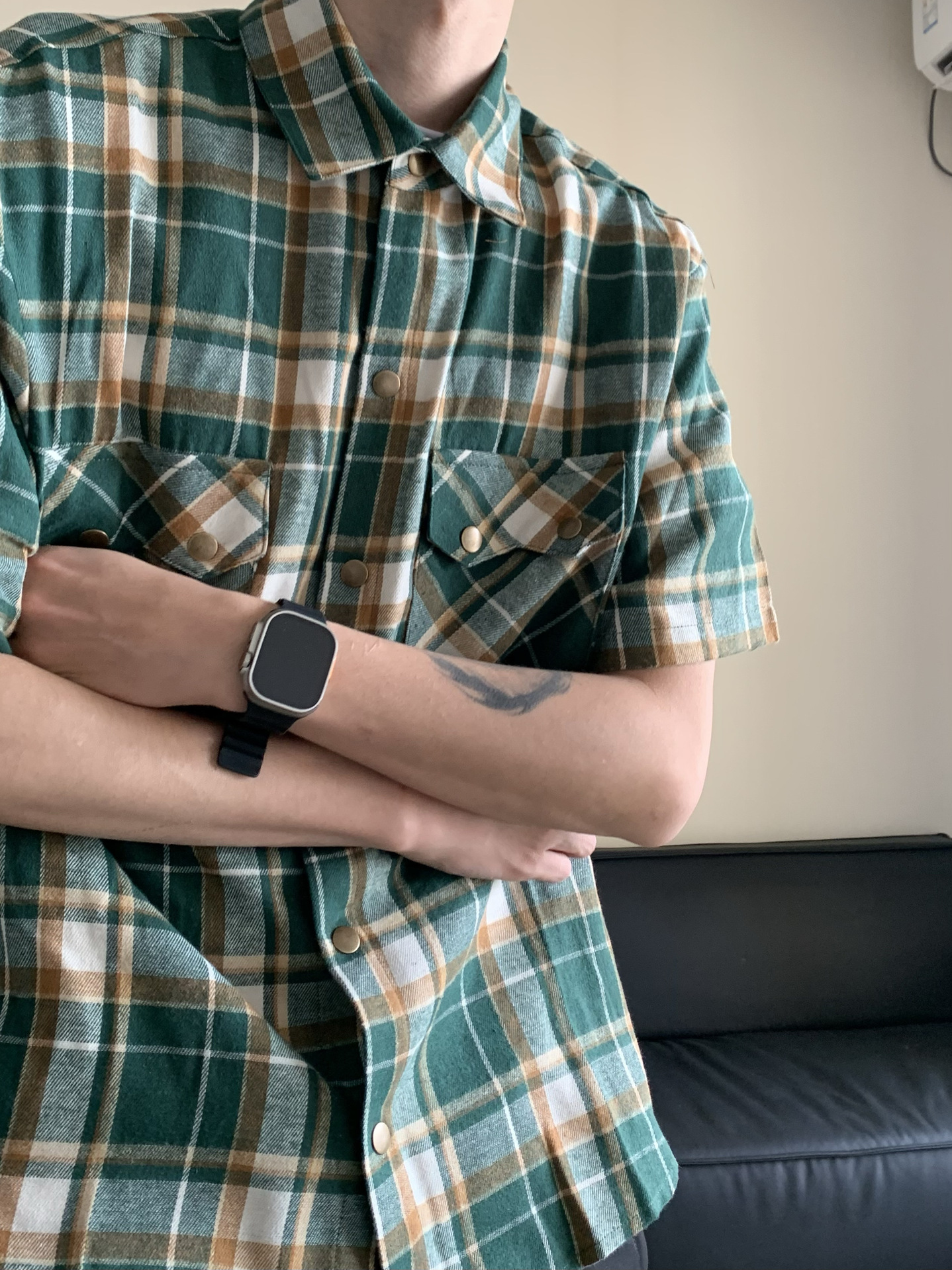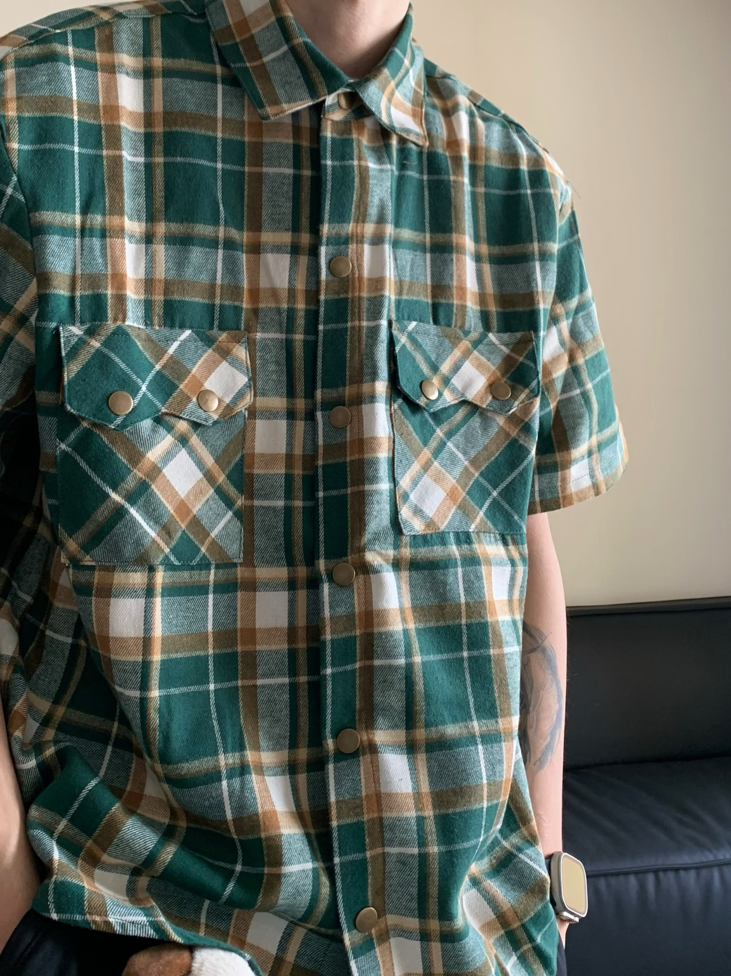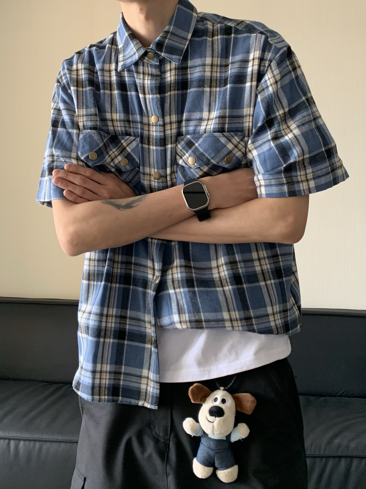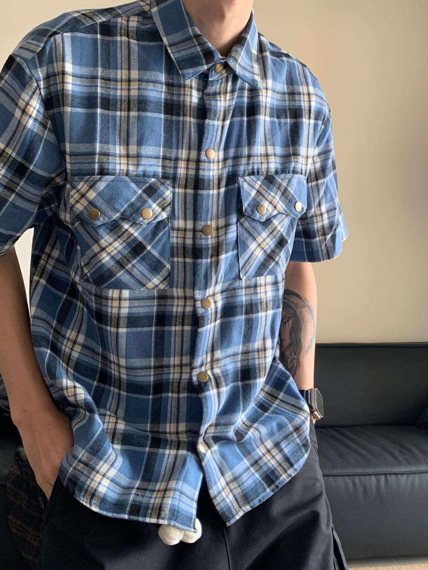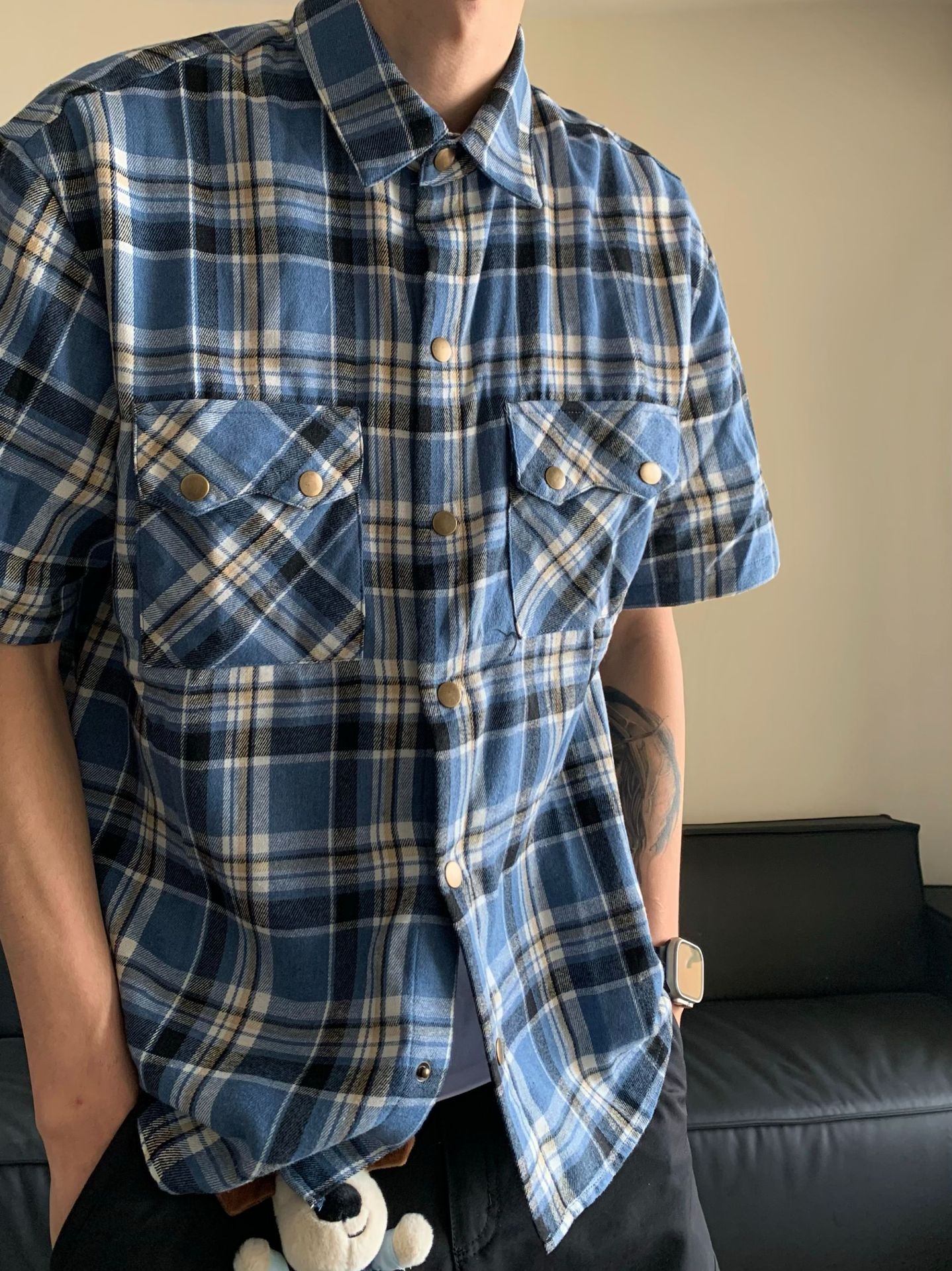 美式复古格子短袖衬衫男夏季新款潮牌vintage高级感半袖上衣