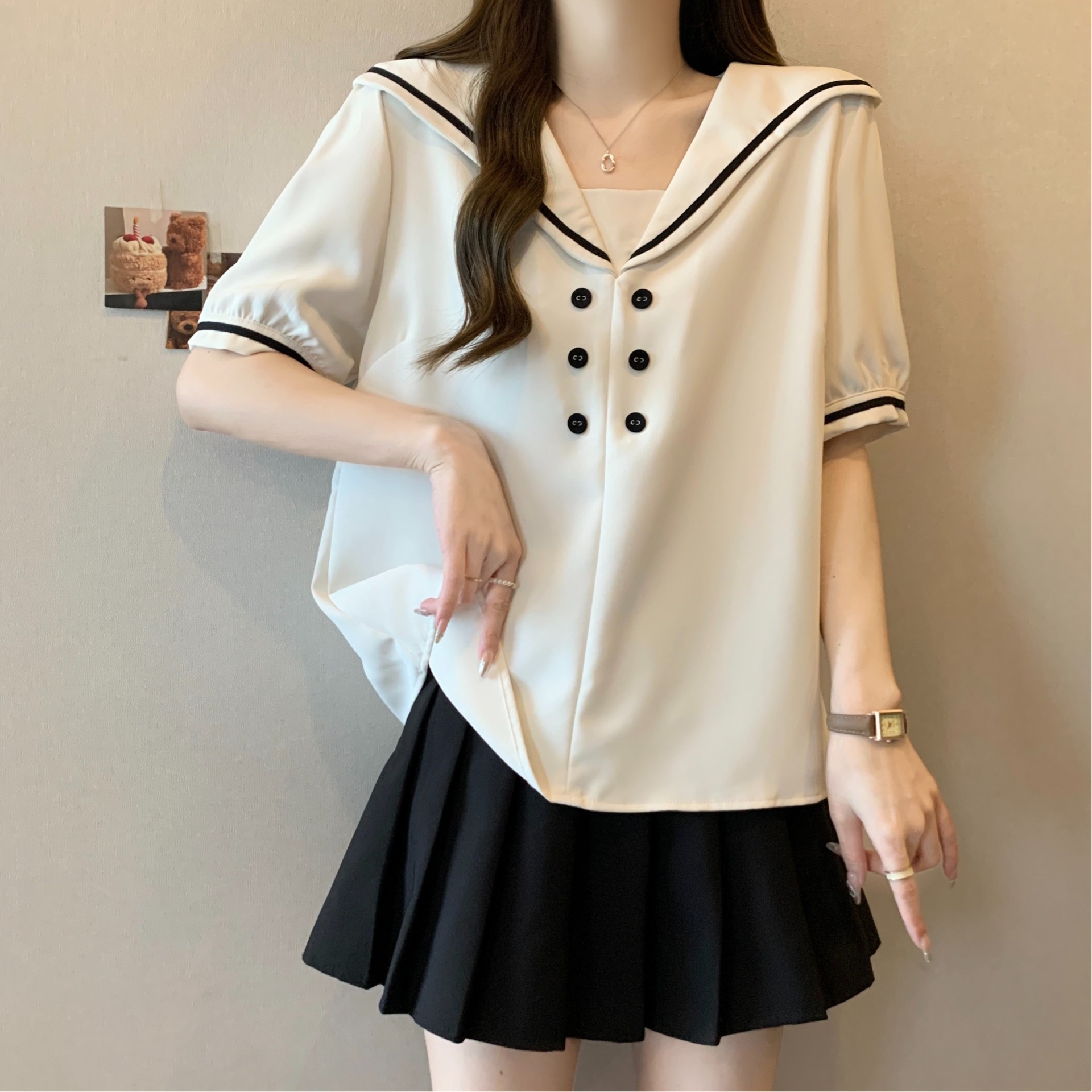 大码胖mm法式条纹短袖衬衫女夏季新款宽松遮肉显瘦海军领上衣