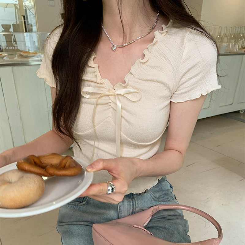 法式气质V领木耳边抽褶短袖修身T恤女夏季新款短款洋气卡腰小上衣