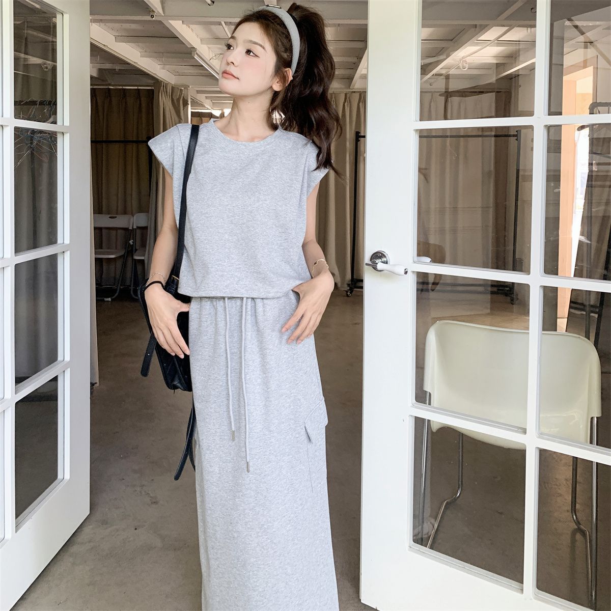 灰色休闲运动套装裙女夏新款可盐可甜飞飞袖T恤半身裙两件套