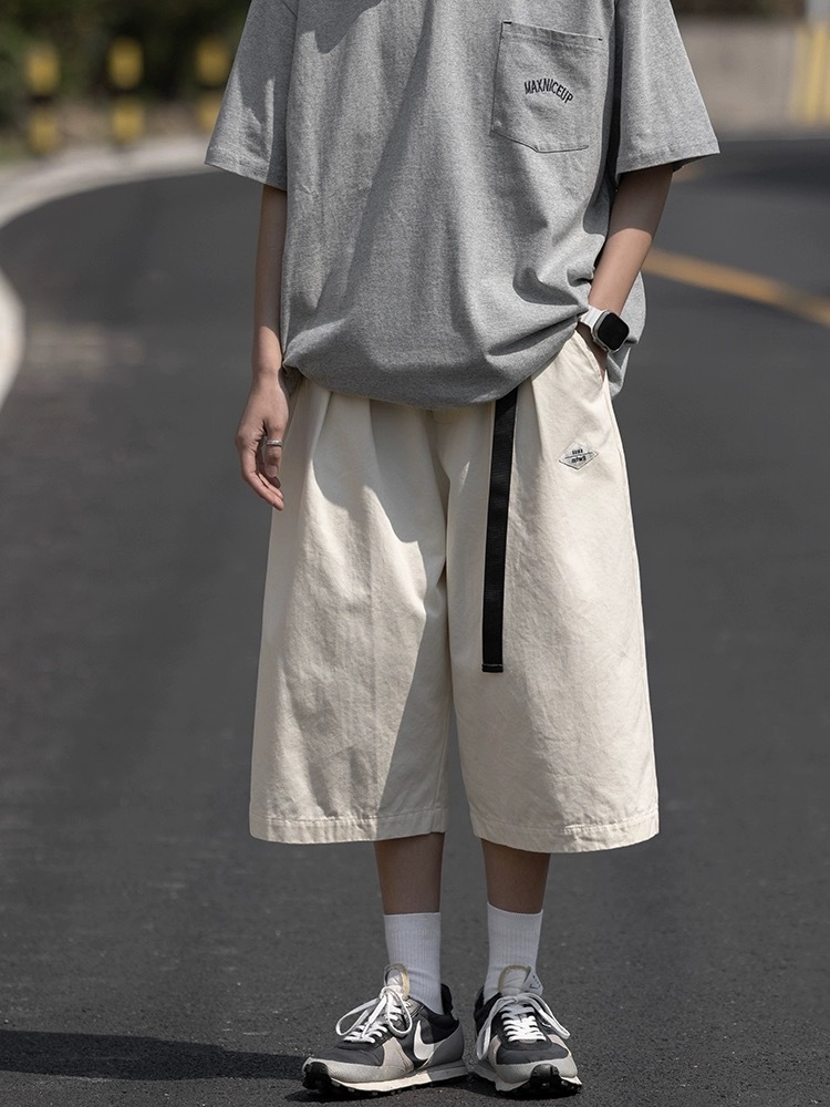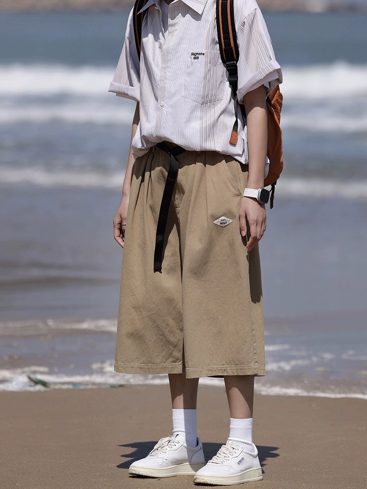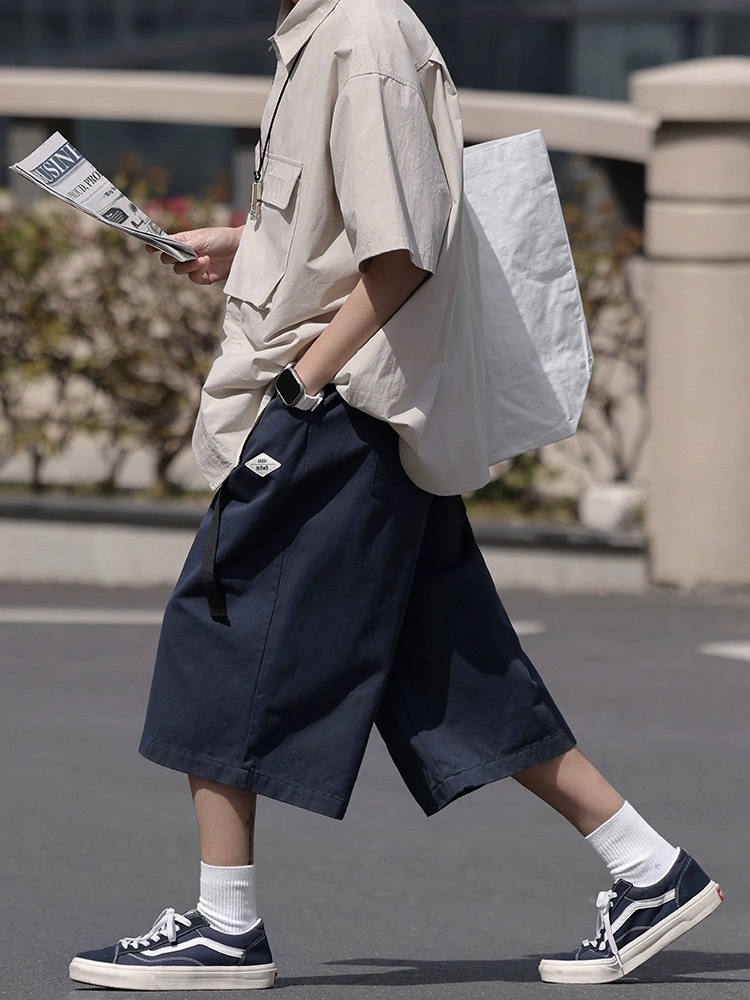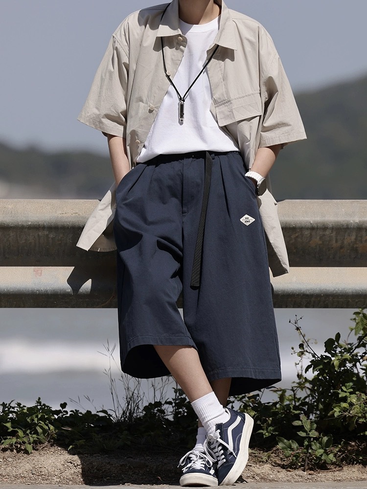 七分裤日系复古男宽松过膝短裤夏季新款纯色休闲7分阔腿中裤