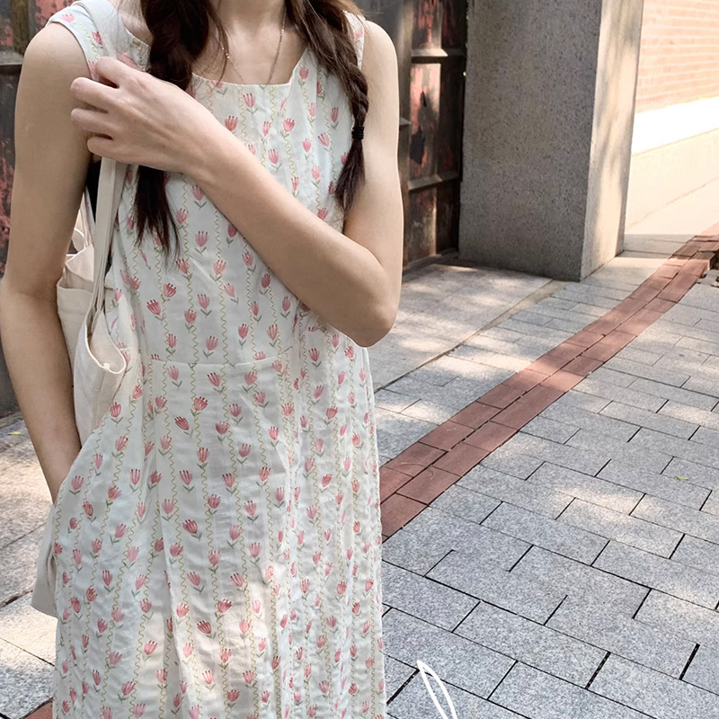 新款女装裙子圆领夏日郁金甜美圆领背心裙百搭减龄花花连衣裙