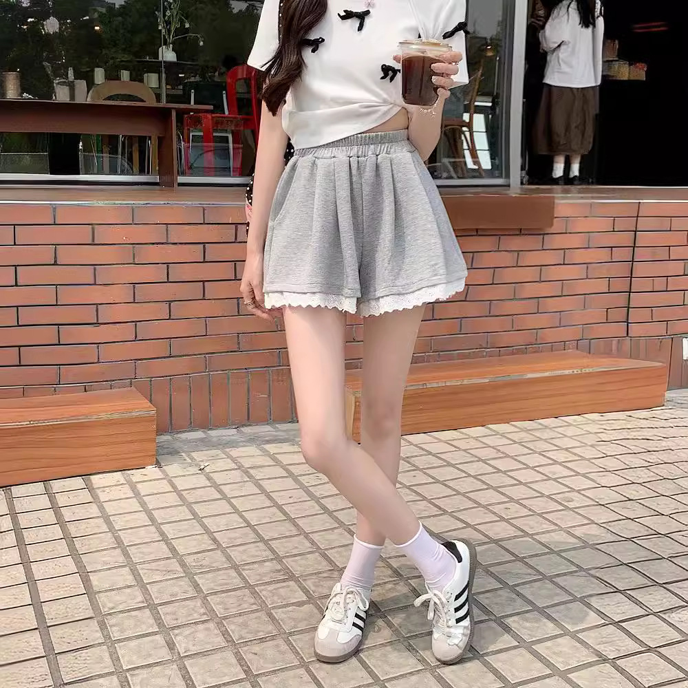 韩国东大门春夏新款时尚蕾丝花边松紧高腰显瘦休闲阔腿短裤女