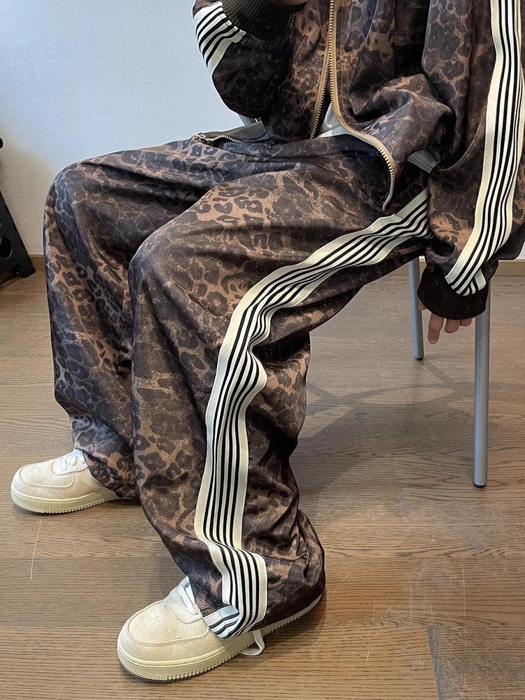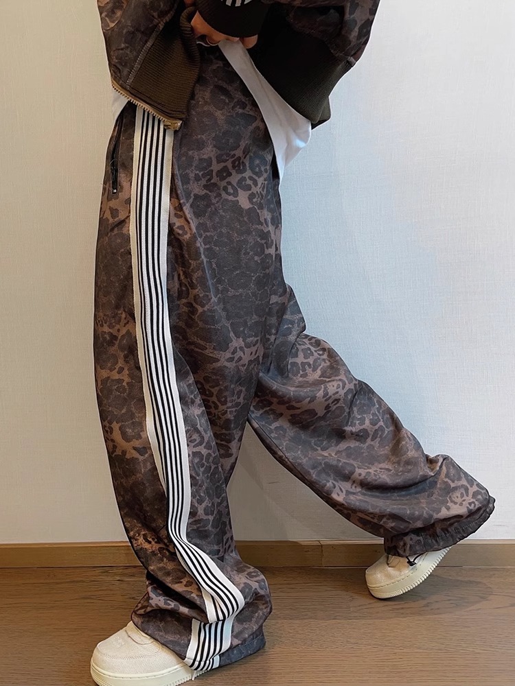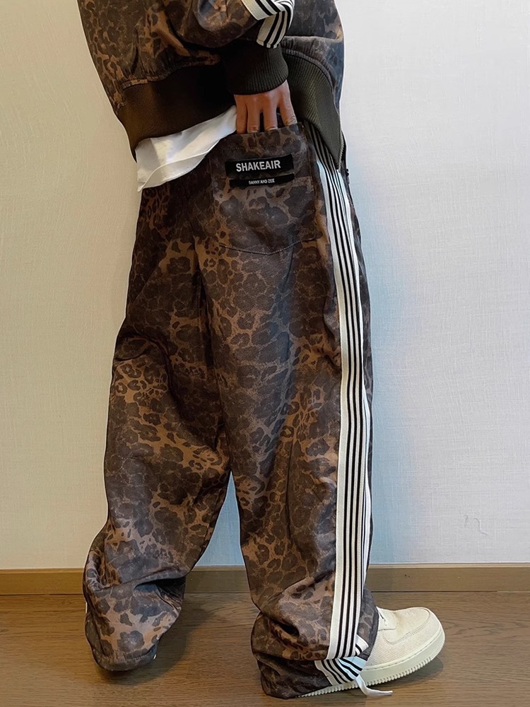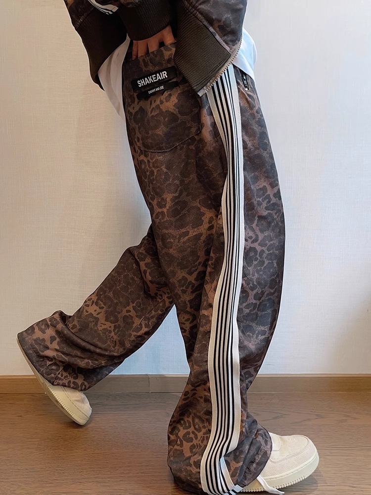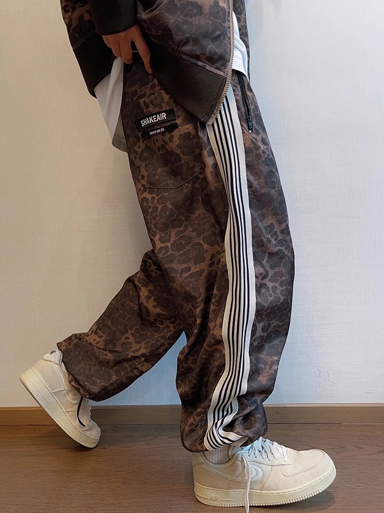 欧美潮牌复古宽松豹纹数码印花拼接条纹休闲裤男直筒裤春秋季新款