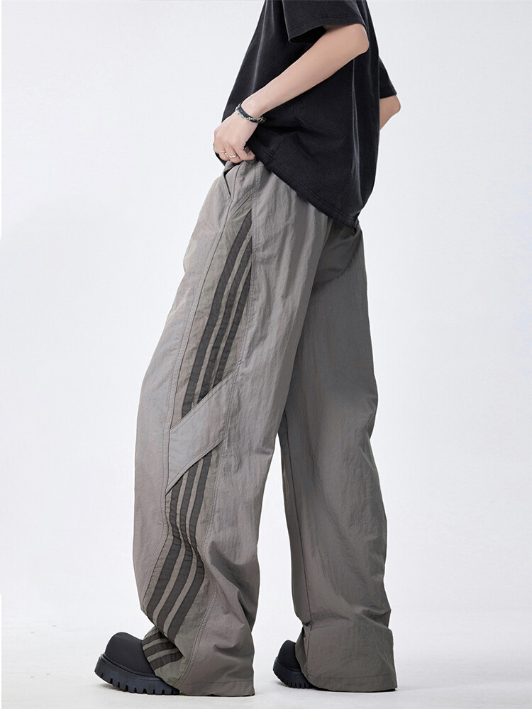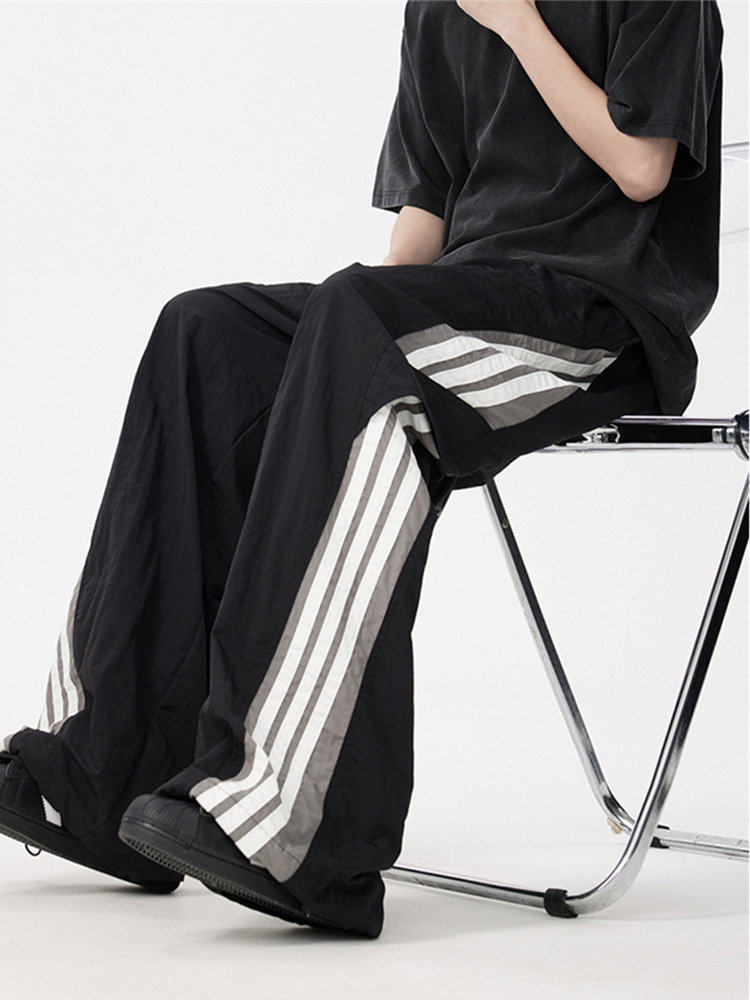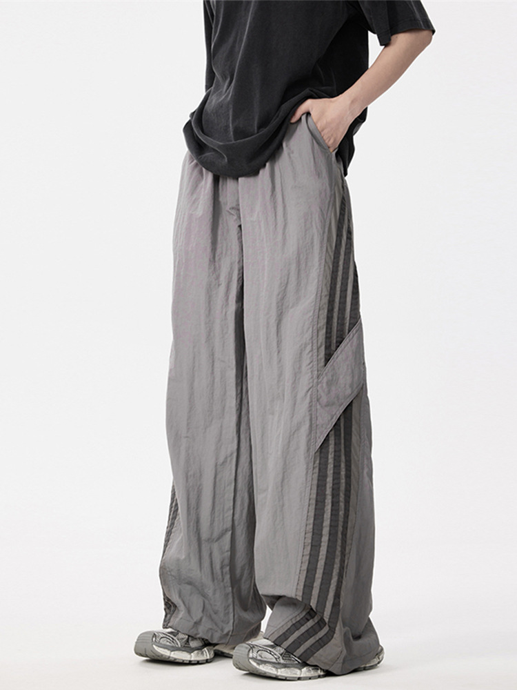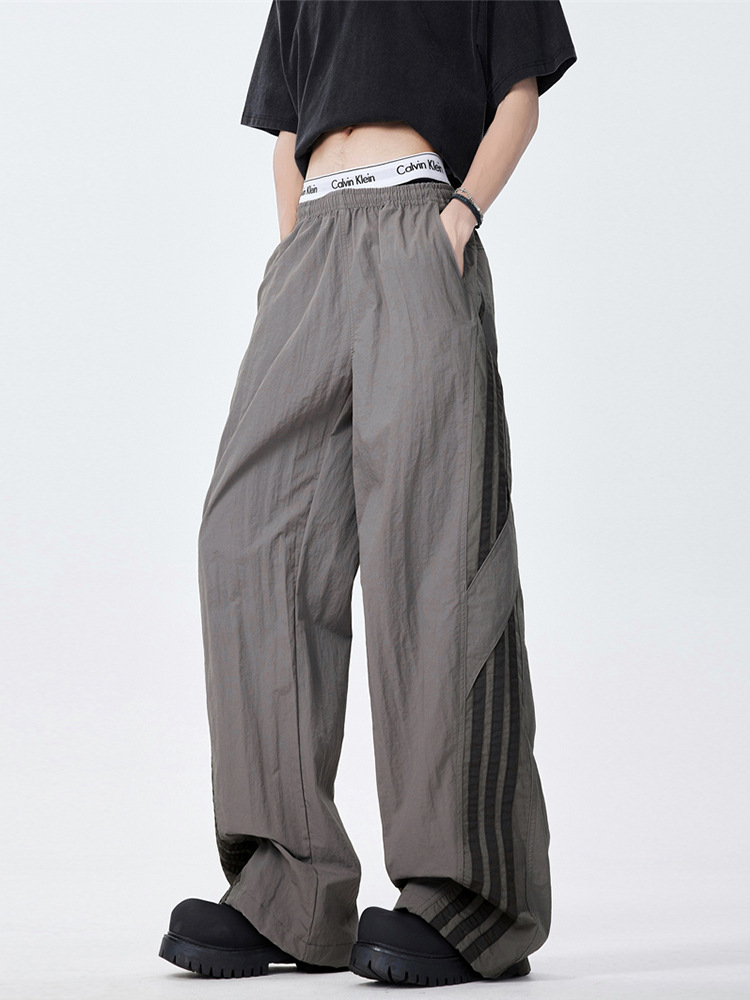 夏季新款速干伞兵休闲裤男宽松直筒运动裤美式潮牌条纹长裤子