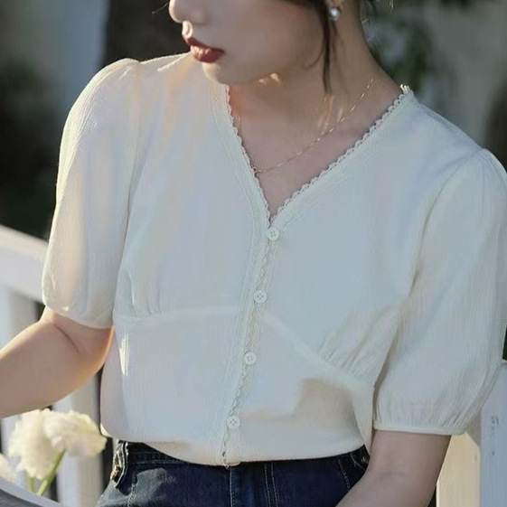 法式杏色短袖衬衫女夏季泡泡袖娃娃衫设计感小众衬衣v领正肩上衣