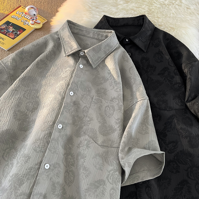 夏季高级感提花衬衫男短袖宽松大码潮流美式复古痞帅半袖衬衣外套