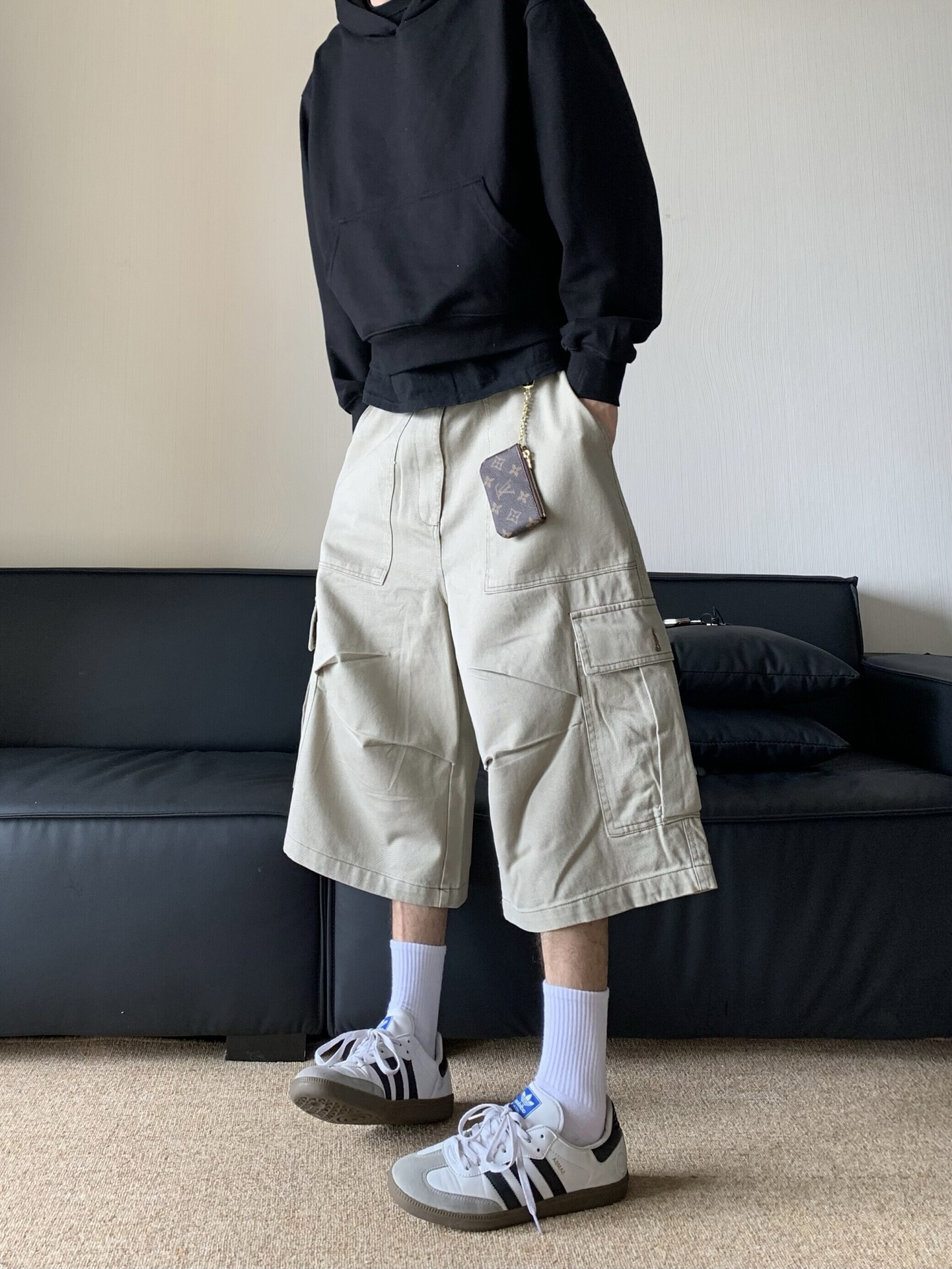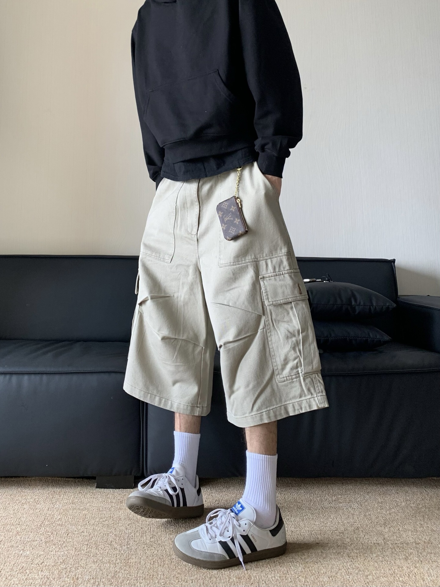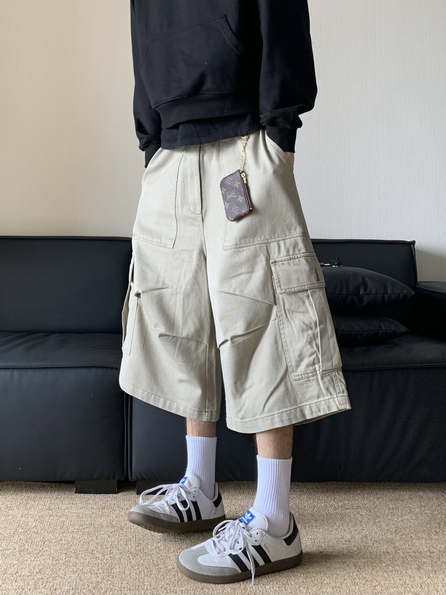 美式复古大口袋阔腿工装七分牛仔裤男夏季新款宽松百搭休闲短裤