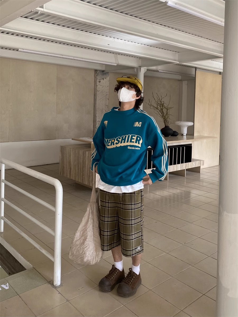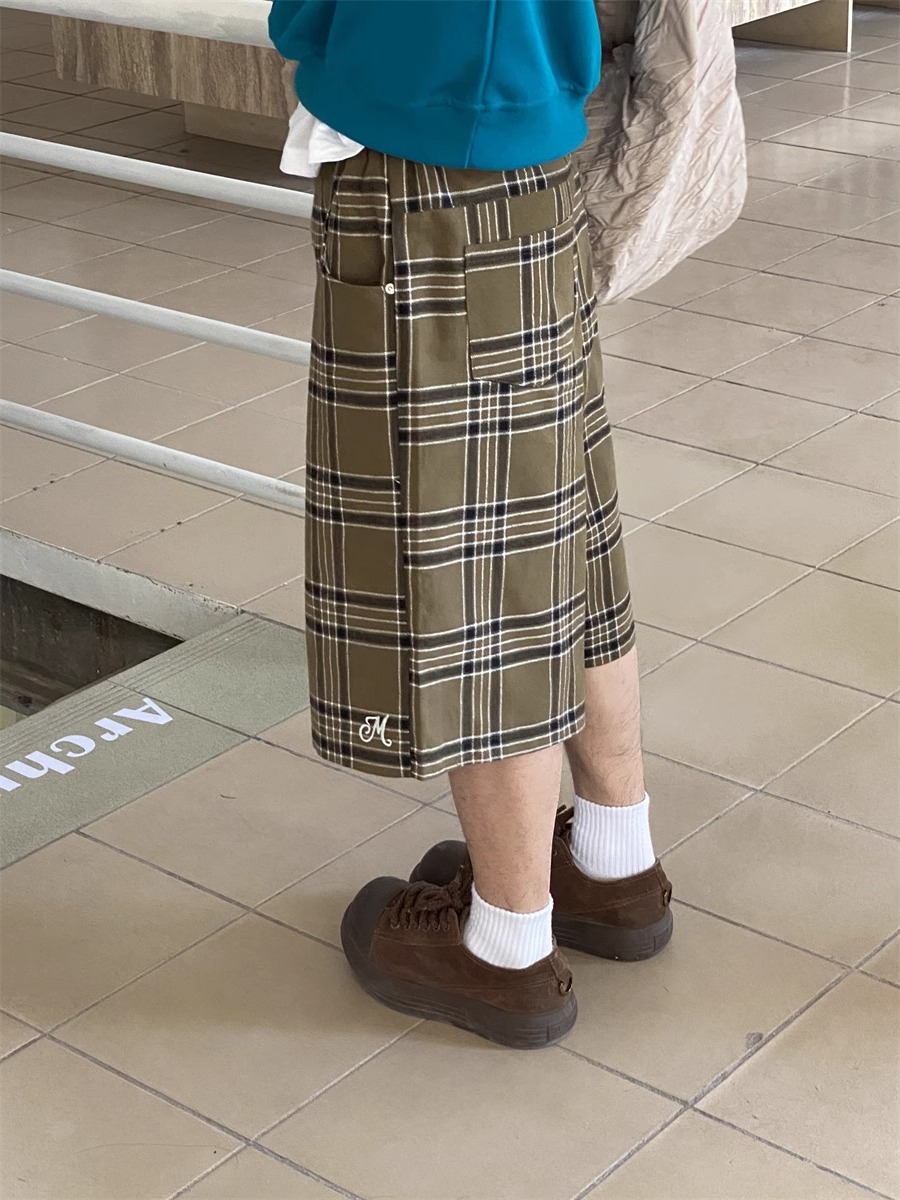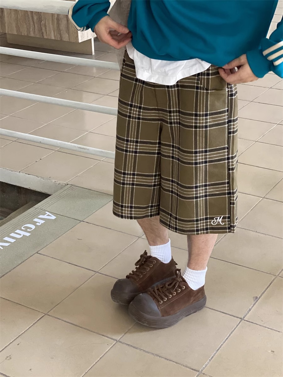 美式格子七分裤苏格兰休闲男春秋季新款A型廓形宽松阔腿格纹短裤