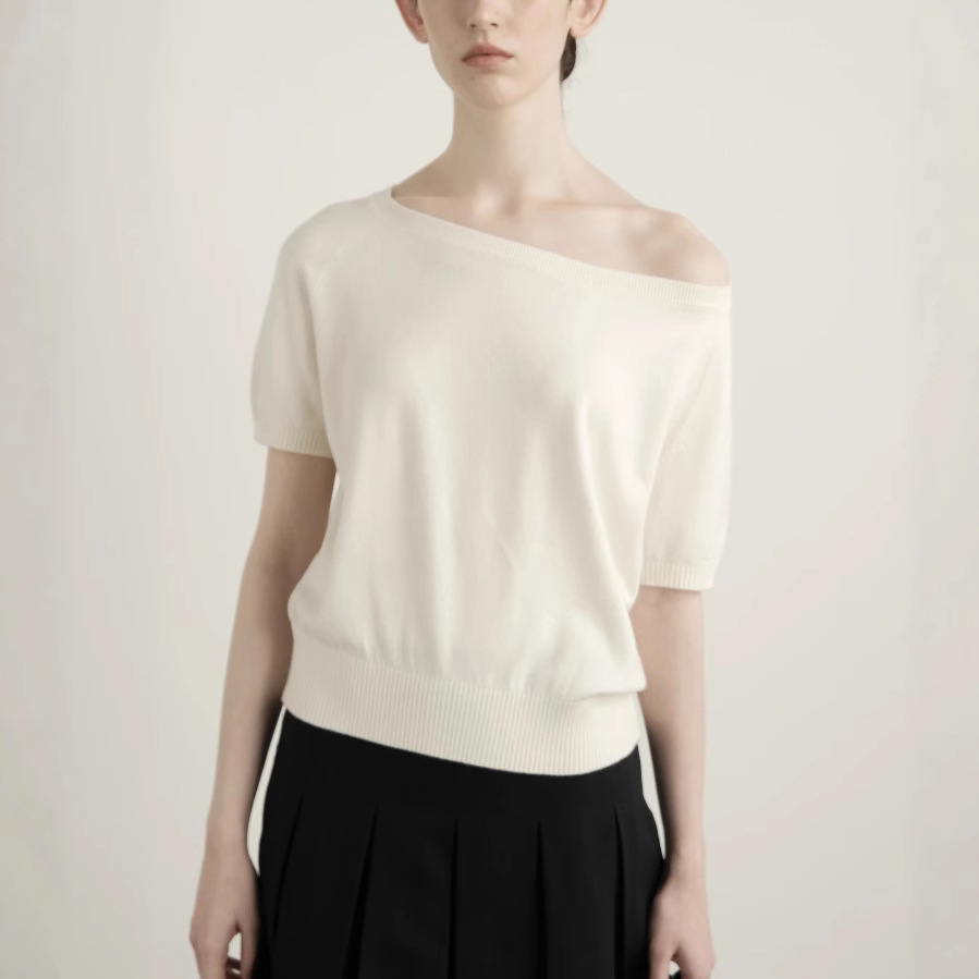 复古斜肩针织衫上衣夏一字肩短袖简约休闲显瘦毛衣t恤女