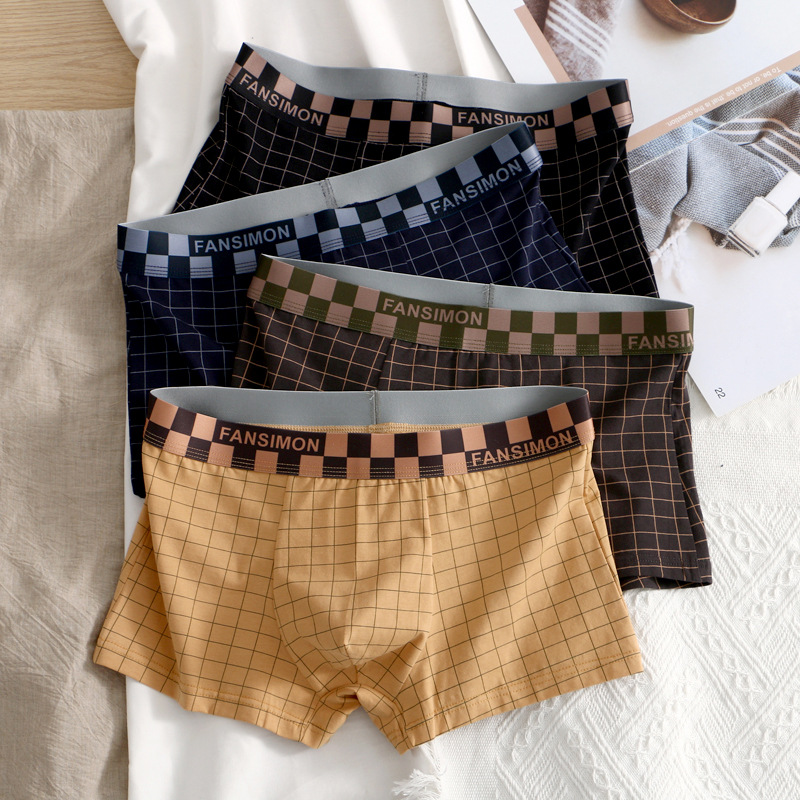 新款男士内裤纯棉舒适透气平角裤潮流格子青年中腰大码男生四角裤