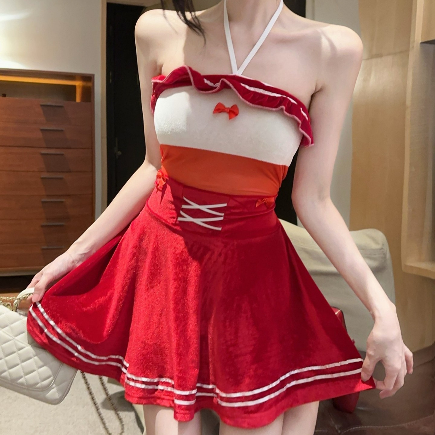 设计感纯欲红色拼接性感蝴蝶辣妹挂脖丝绒圣诞聚会时尚大摆连衣裙