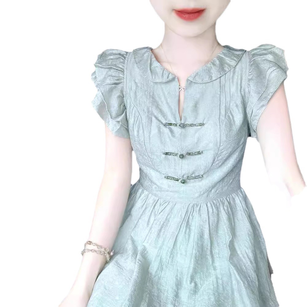 新中式国风小飞袖长裙夏装新款法式温柔风显瘦薄荷绿连衣裙女