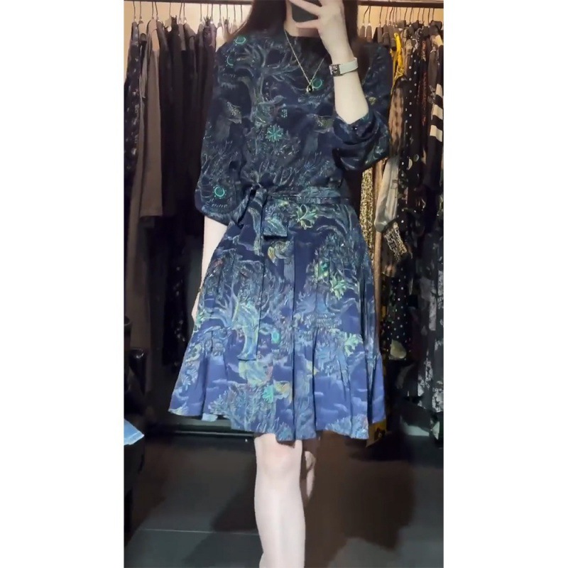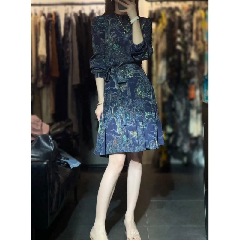 年春季新款法式御姐风气质蓝色裙子国风收腰显瘦碎花连衣裙子
