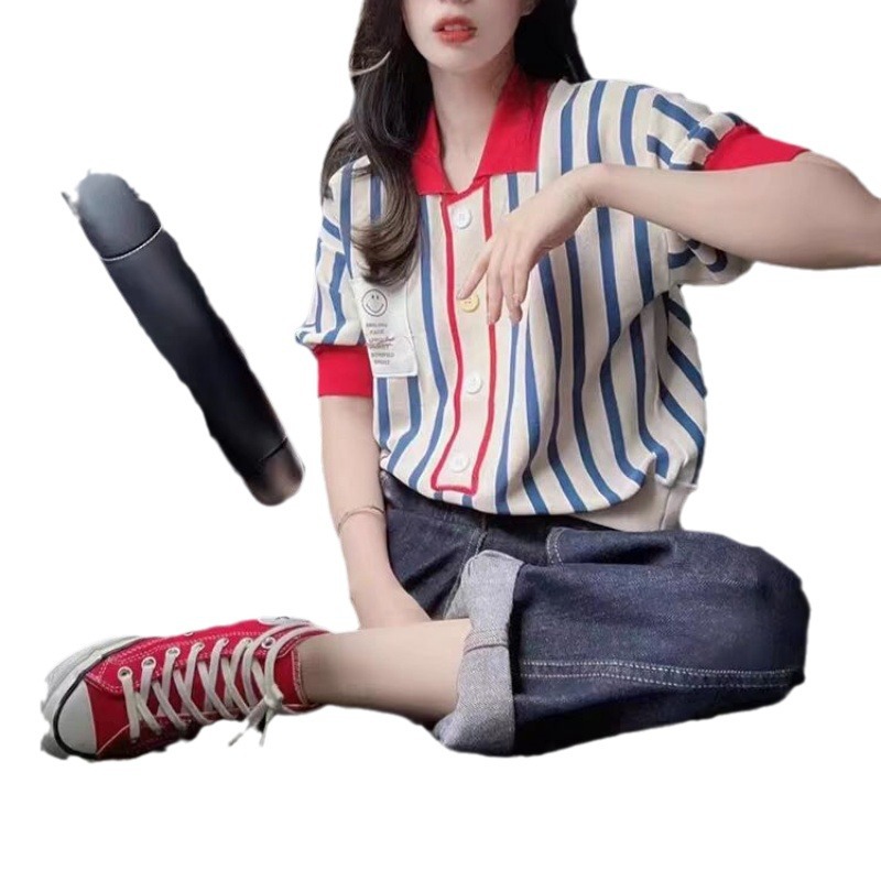 年美式复古条纹POLO领短袖衬衫女温柔风减龄别致宽松显瘦T恤