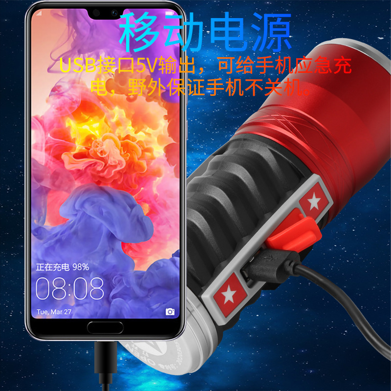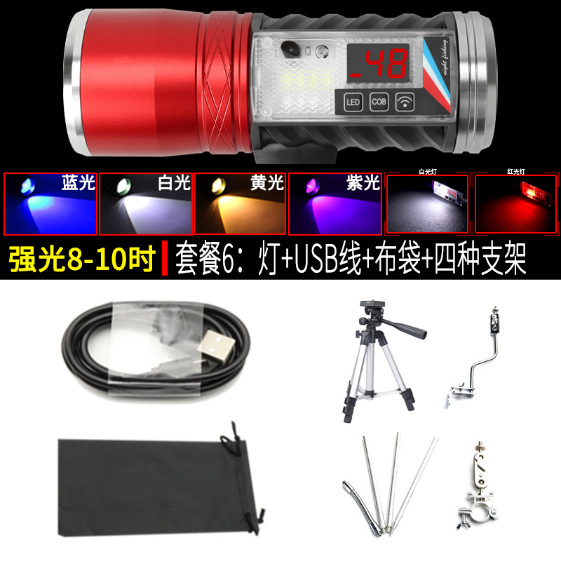 新款智能六光源夜钓灯 USB手机充电电池可拆卸 T6蓝光强光钓鱼灯